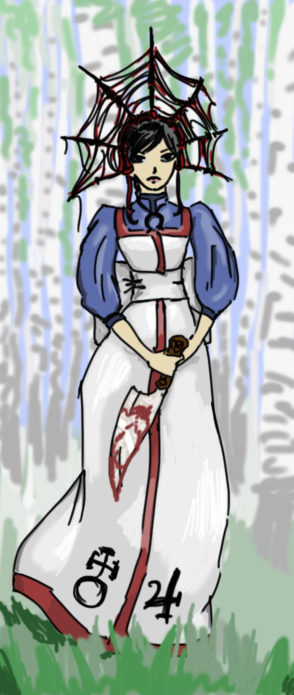 >Анон, нарисуй, пожалуйста, Алису из American McGee's Alice или из Alice Madness Returnes в сарафане, в кокошнике, она держит в руках окровавленный нож. Она стоит на фоне березок и дубков.