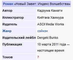 Первый сезон Индекса охватывает с 1 по 6 тома ранобэ.