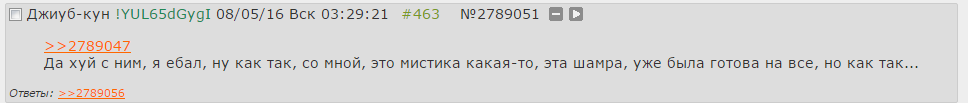 Читала весь тред. Нахуя? Не знаю. Но у меня возникли вопросы. С какого перепуга у меня был ебырь с двача? единственное я пыталась склонить в свою сторону коего кого из треда, чье имя нельзя называть, иначе затравят Далее. Кого там мацал джиуб, если на сходке из тян только пм, как я понимаю, была. И самое выдное, как выглядит джондоу?