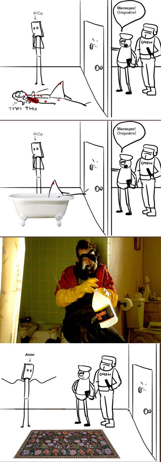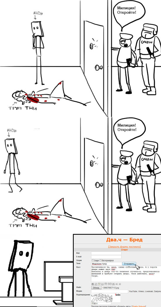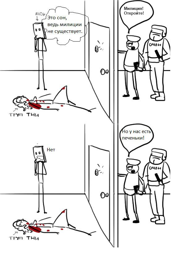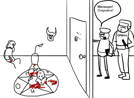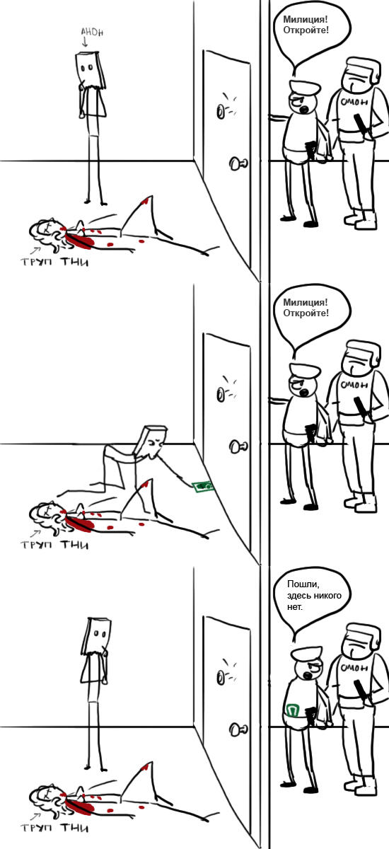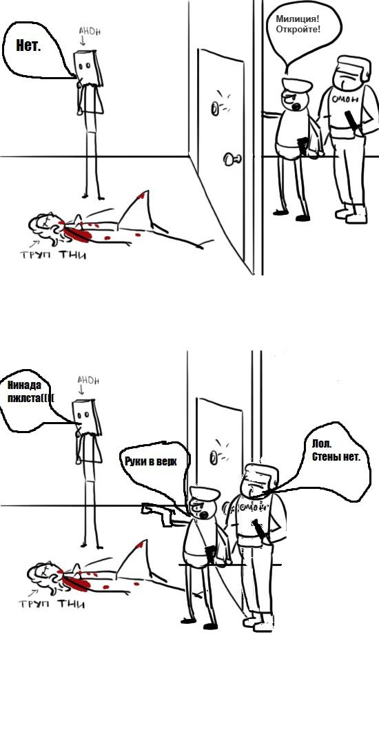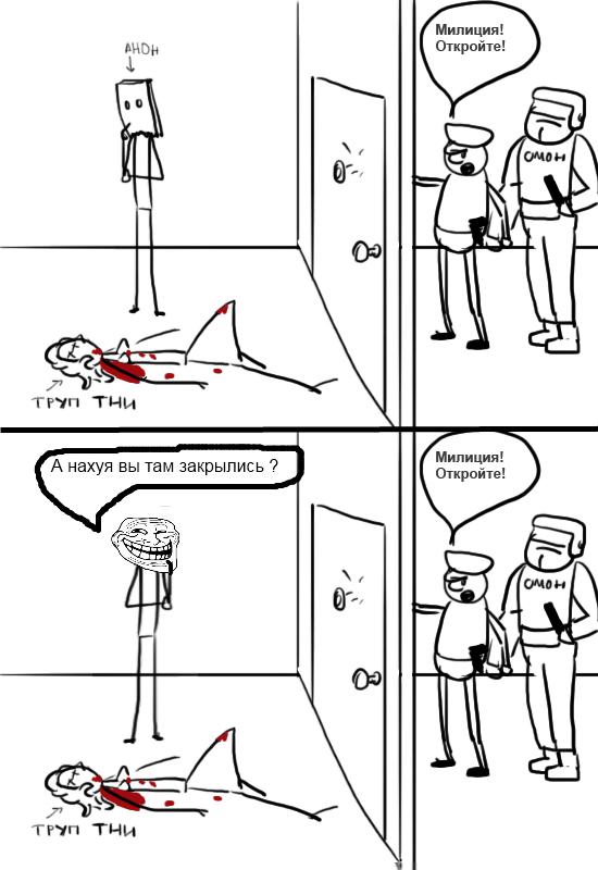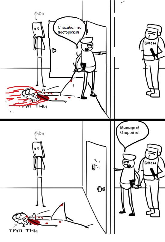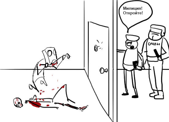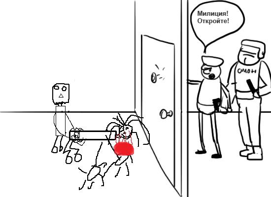 Внезапно в дверь кто-то начинает стучаться, представляется милицией и требует открыть дверь. Твои действия, анон?