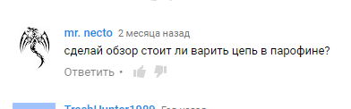 Бля чет все равно хуйня какая-то с парафином, теперь всего 50 до шелеста продержатся, вот хуй знает хочется обратно на масло откатиться, тупо ради тишины а то перед каждой поездкой цепь варить тож не особо удобно. Кстати может передние звезды как-то парафином натереть не? А то шелест именно от них идет, сзади вроде все тихо.