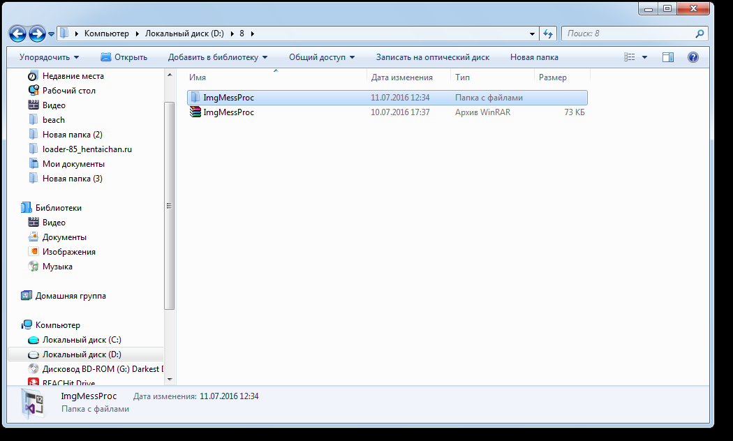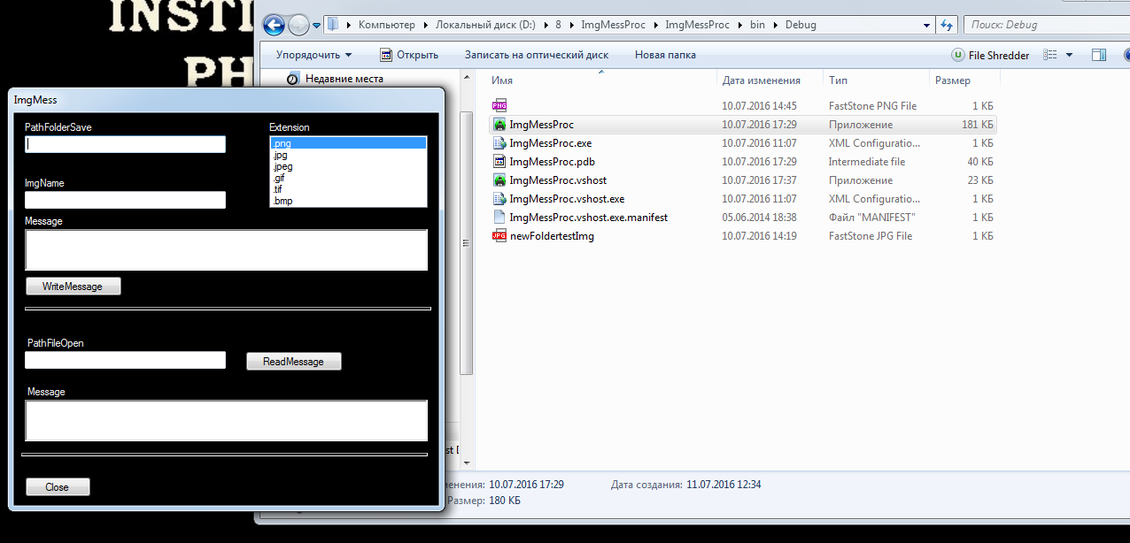 Итак, как обещал, рассмотрим подробно реализацию проги. В начале небольшое вступление. В архиве лежит папка ImgMesProc, содержащая в себе все файлы этого проекта - первая пикча. При заходе в нее обнаруживается файл ImgMesProc.sln и еще одна папка ImgMesProc - это собственно папка со всеми файлами этого проекта. ImgMesProc.sln - файл проекта в Visual Studio. Выше анон спрашивал пойдет ли он под линукс - ответил что скорее всего нет. Однако далее будет детально рассмотрена алгоритмическая и логическая часть реализации. Знакомые с плюсами смогут быстро перепилить логику с c# на плюсы, для остальных напилю вначале плюсовый вариант под винду, потом под линукс. Это все относительно второй пикчи. В папке ImgMesProc находятся рабочие файлы проекта. папка bin - содержи экзешник проекта и еще всякую всячину папка obj - рабочие сопутствующие проекту файлы, они тут рассматриваются и полезной инфы не по теме не несут папка Properties - еще одна рабочая папка App.config - служебная инфа Exceptions.cs - вот теперь начинаются собственно исходные кода проекта. Данная папка содержит пользовательский класс обработки ошибок и исключений проги. Будет подробно рассмотрена далее. Form1.cs - исходный код оконной формы с пользовательским интерфейсом. Будет подробна рассмотрена далее. Form1.Designer.cs - еще один файл формы. В данном вопросе ценности не имеет. Form1.resx - еще один файл формы. Так же не будет рассматриваться. ImgMesProc.csproj - собственно файл "проекта" ImgProc.cs - файл с исходным кодом обработки изображений. Будет подробно рассмотрен ниже. Program.cs - служебный файл, рассматриваться не будет. TableTranslation.cs - исходный код таблицы трансляции. Будет подробно рассматриваться ниже. Это все относительно третьей пикчи. В самой папке bin находиться только папка Debug, а в ней множество файлов и среди них ImgMessProc.exe - файл для запуска программы. Это относительно четвертой пикчи.