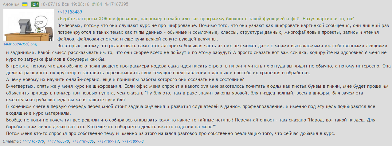 >>17328272 >Детей плохому тоже учить не надо. А с чего ты взял что плохому? Например если в теме идет рассмотрение wav-формата, надо же поучится в него делать запись данных в дату напряму и считывание с него. Почему бы в таком случае не позаписывать чаровские символы? Люди еще раз вспомнят что такие слова как байт, слово, квад - они не просто так появились. Если в кулинарном училище учат как разделывать мясо, разве это плохо само по себе? Ну да, вместо баранины точно так же можно разделать и что-нибудь другое, но это уже тонкости и частности. Кроме того, шифровка сообщений пикчами не самоцель курса - она туда начиная с позапрошлой недели аккуратно вплетена. Ну и на самый конец - если бы людям не нравилось, они бы ко мне не ходили. У меня не университет, где ходят ради диплома и что бы не попасть в армию. Если народ вместо того что бы на свои деньги снять шлюху, побухать или сгонять на курорт решает прослушать мой курс от начала до конца - ну хули, их деньги и их право.