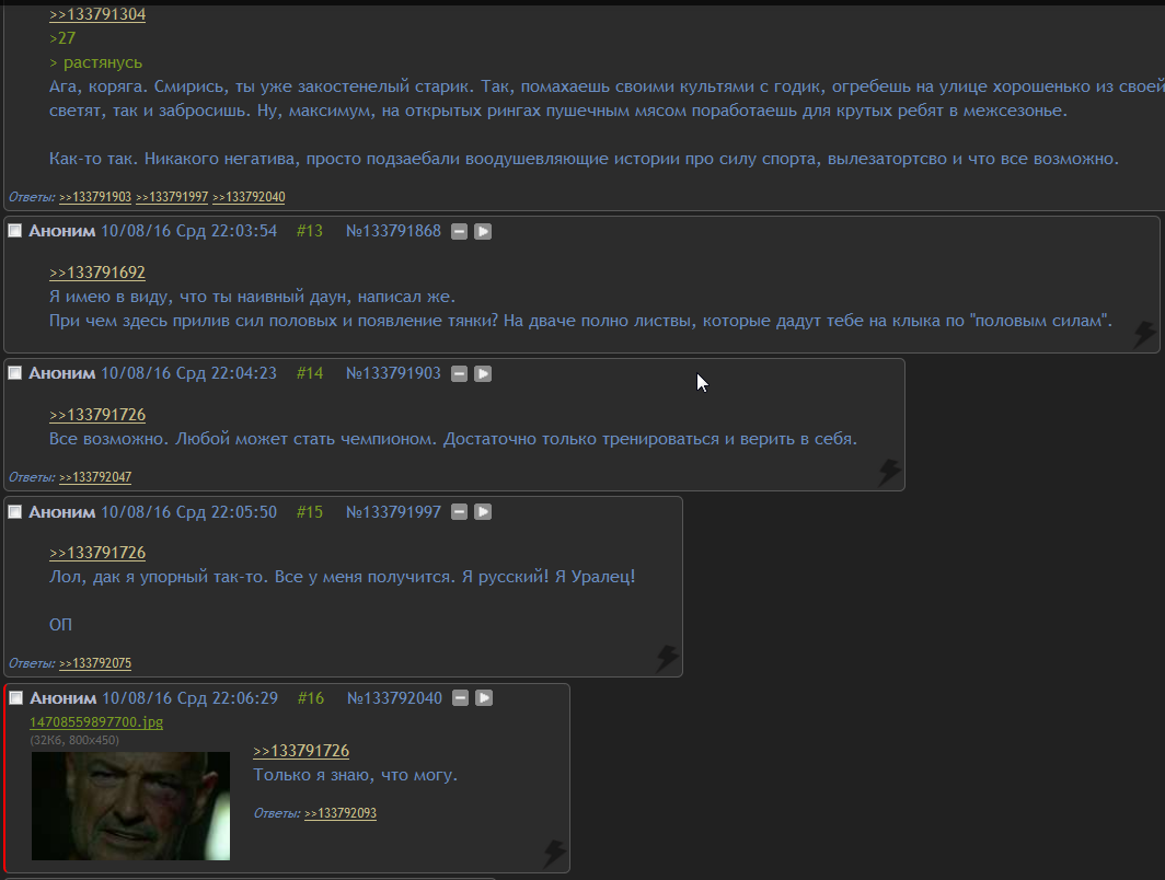 >Зачем, ну зачем ты продолжаешь пытаться решать за других, как им жить? Почему ты не можешь просто высказать свое мнение, зачем пытаться это в такой ультимативной манере излагать, типа все пидарасы и ты один д'Артаньян? Я, по-моему, вполне очевидные вещи говорю. Зачем искать факультет экономики в тракторном вузе, когда есть вышка? Зачем искать кроссфит в чем-то еще, когда есть сам по себе кроссфит и очень увлекательный и разносторонний. Если ты не в силах это осознать, то у меня для тебя плохие новости. А вообще, единственная причина такой категоричности в том, что я вижу очередного маню, который повелся на распространенные заблуждения и не способен этого осознать.