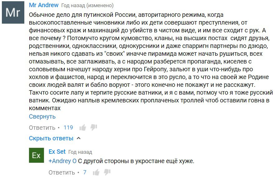 Больше всего бомбит именно от этого пункта. Дочь мелкой сошки, ничего не представляющая из себя и не являющаяся какой то долларовой миллионершей или сотрудницей силовых ведомств, НО как её выгораживали и на каком уровне. Вот уж, действительно, своих не бросаем.