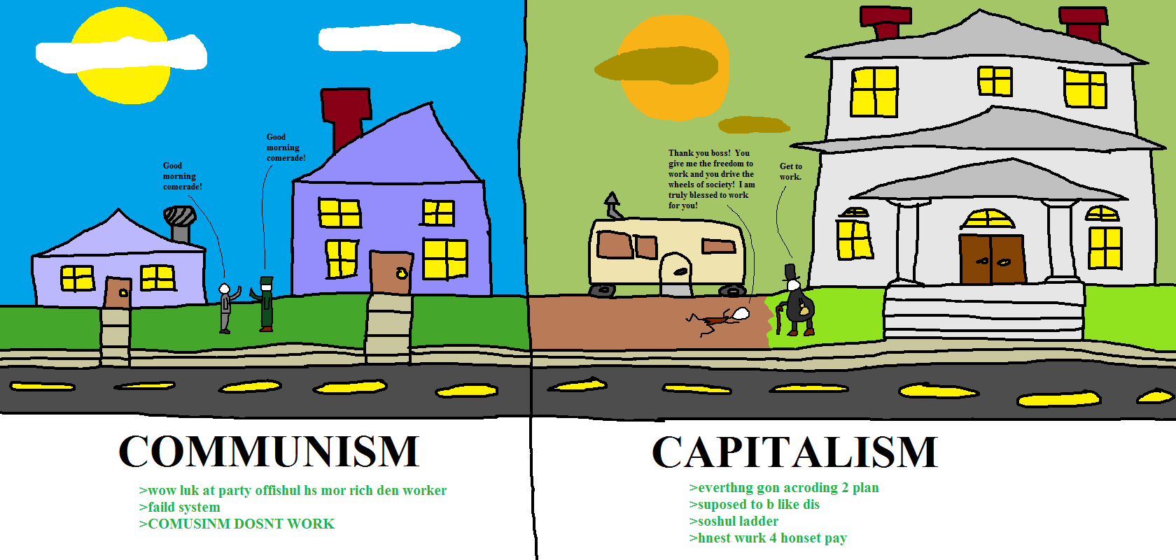То, что тебе херово живётся, мой милый левый друг, ещё не означает, что экономическая и социальная ситуация в странах с капиталистическим строем плохая. Плохо живётся тем, кто не хочет учиться и работать. Т.е. людям с левацкими убеждениями, будто бы их капиталист эксплуатирует. Есть честный обмен (при добровольном договоре) труда на заработную плату. Не хочешь работать на дядю, копи капитал, устраивай бизнес. Какие-то вопросы?