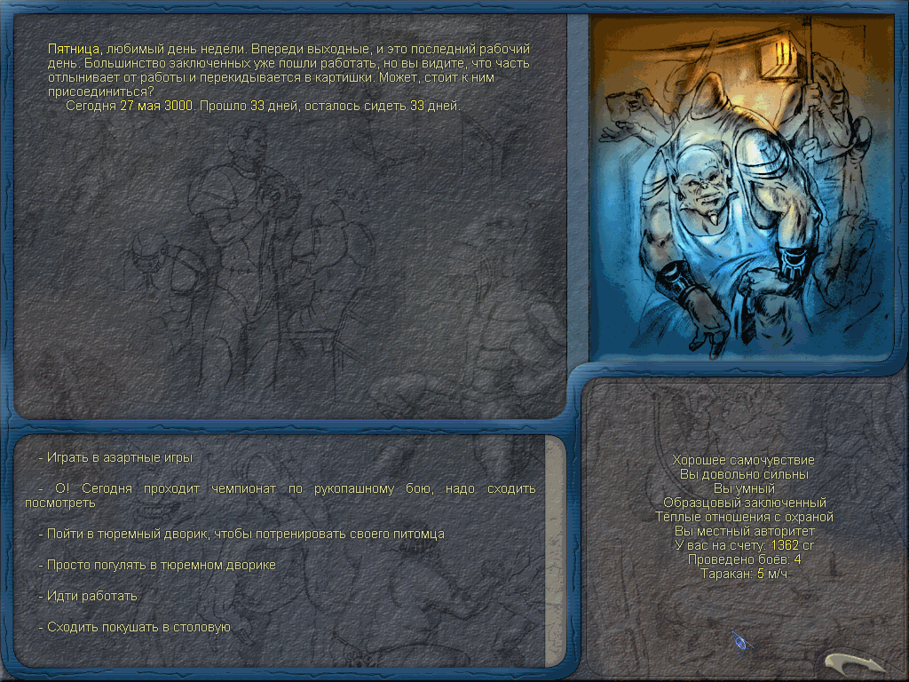 В тюрьме проще всего качаться и пиздить всех, отжимая бабло. Если повезёт можно съебать досрочно, победив на арене. Качать мозги и играть на деньге, при этом отдавая выигрышь на откуп вертухаям и зекам - хуёвый вариант.