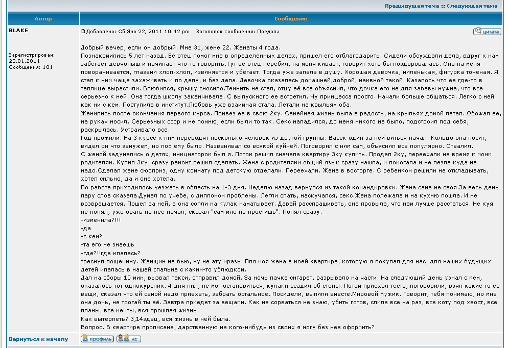 Я просто стоял и смотрел. В голове шумело от повышающегося давления. В глазах уже танцевали огоньки. А эта падла мне говорит: "Понял, сука? Так что прощайся с тян-нейм. Не для тебя она". А я как-то даже не помню, что случилось дальше. Пришёл в себя, когда яростно вбивал кулаком в землю ебальник этого ерохина. Как-то стрёмно стало. Лежит он, кровищей харкает. Плачет, уродище. А я представил, как он заяву катает и меня пихают под шконку. Очко сжалось, потому отпустил я урода. Встал и ушёл. Вернее, почти убежал. Мне хотелось побыстрее закрыться в своей квартире и больше никогда оттуда не выходить. Ерохин этот, правда, заяву не накатал. Но и тян я послал на хуй. Сказал, что не имею желание целовать губы, от которых несёт хуем. Она догадалась, что я имел в виду. Рыдала, просила проситить. Говорила, что не виновата, что сама не знает, как так всё случилось. Но я что-то так в тот момент ненавидел её, что даже замахнулся уебать по наглой роже. Но вовремя остановился.