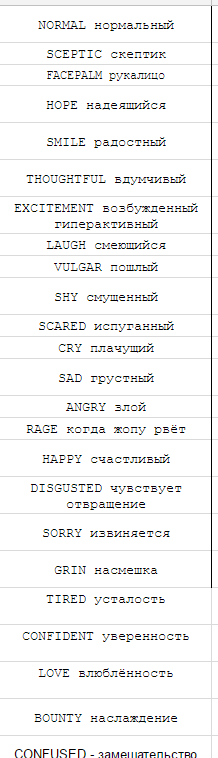 Если на какую то эмоцию хочешь несколько пиков - создаёшь для него папку. Называешь папку эмоцией, а сами пики, а скины внутри папки - "1" "2" "3" итд.