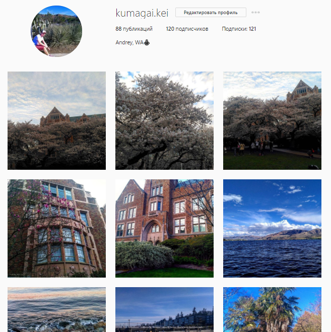 1. https://www.instagram.com/kumagai.kei/ 2. Природу одного тихого штата, а иногда и других. А иногда и не природу вовсе. 3. Huawei Honor 5X. 4. Любые, основной темой которых не являются селфи. 5. Андрей, 18 лет. Ученик старшей школы в Штате Вашингтон. Взаимно подпишусь и оценю ваши аккаунты. Не отписываюсь, только если вы не сделаете это первым.