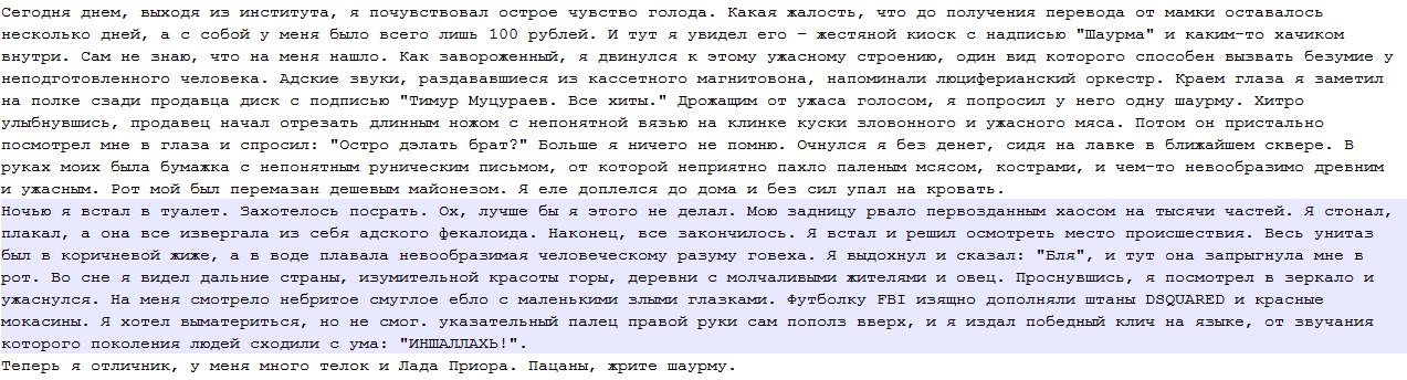 — Приятно, да? А я вчера целый вечер это говно жрал.