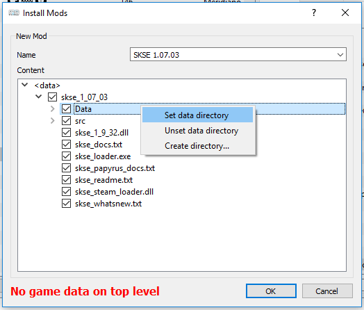 >skse_1_9_32.dll >skse_loader.exe >skse_steam_loader.dll >Копируешь их в корень игры (где лежат SkyrimLauncher.exe и TESV.exe). Затем устанавливаешь этот же архив чере МО как обычный мод.