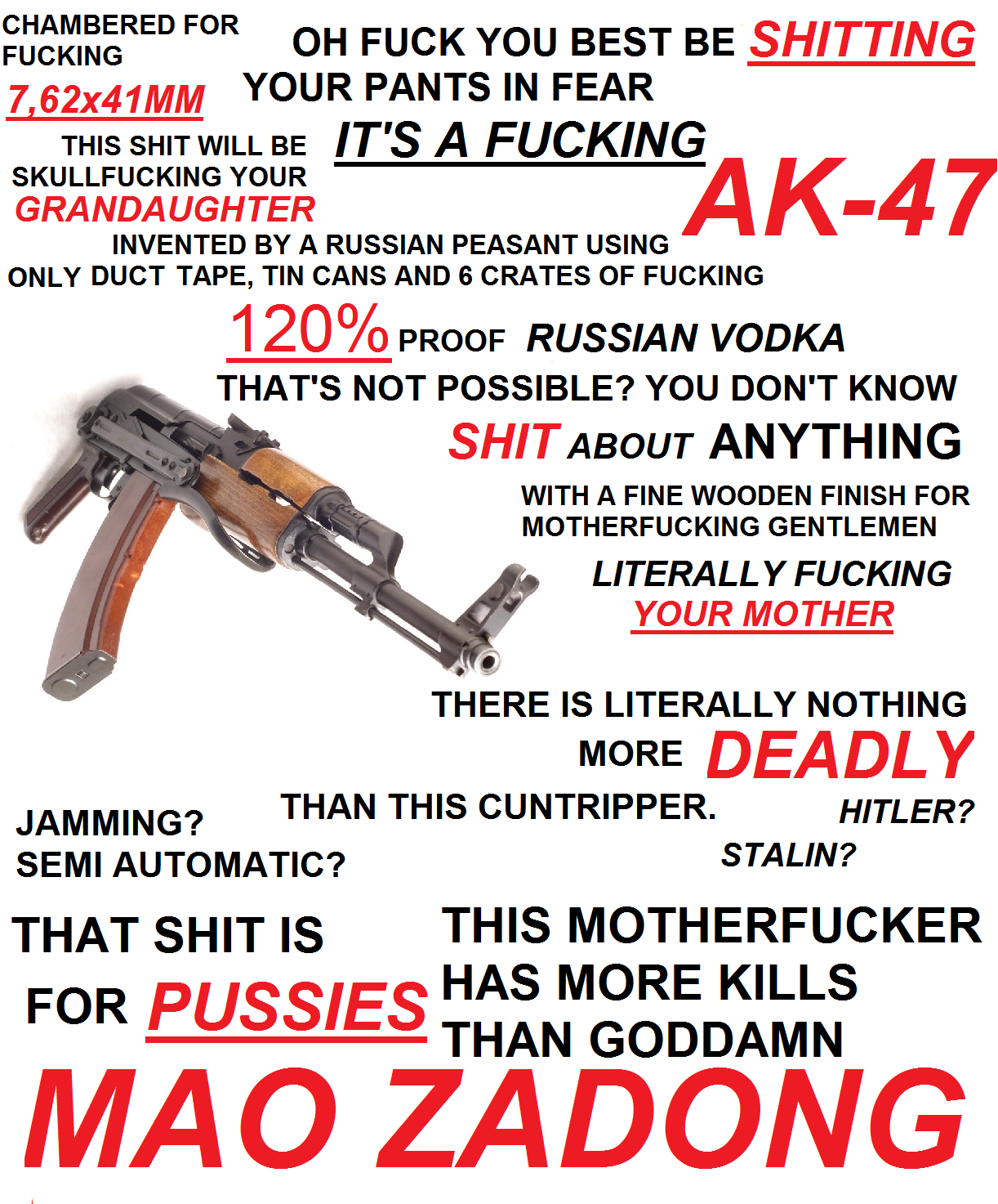 Русский Ватник всегда за справедливость, мир и братство. США всегда за войну, свои интересы и геноцид (кстати!!! А вы в курсе, что экономика США живет за счет войны?! Вот цитата из лживой американской газеты New-York Times!!! Сам блять переводи!!!). Русский Ватник доходчиво объяснит, как зассали америкосы воевать с Гитлером и ждали, когда Ватник победит всех, а потом в 1944 году подмазались к нашей Победе!!! (хитрые суки!!!! Какой блять ленд-лиз, какая война с Японией, какая высадка в Сицилии!!!!!!!! Сука сравни потери!!!!!!!!!!! Блять!!!!!! Да если б не деды!!!!!).