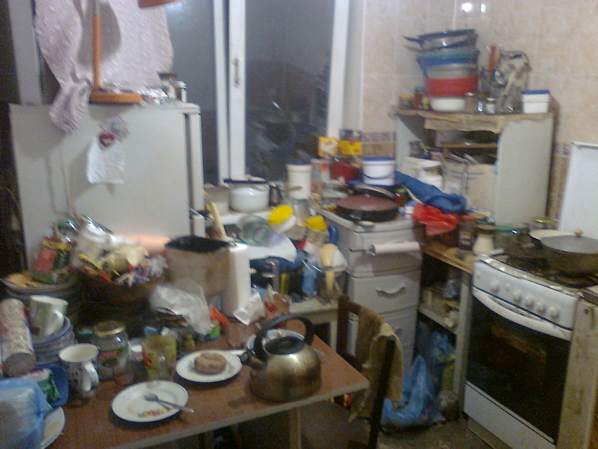 У тебя хоть просто какие-то вещи, намного хуже всё когда в таких грудах хлама, появляются всякие бутылки пластиковые блядь, мусор всякий, сломанные вещи не выкидываются и всё это покрыто слоем пыли. Одна из конфорок на плите занята чернющей посудой - нахуй её мыть. Под раковиной что-то растёт уже. Из холодильника несёти никакие уловителидаже побольшене помогут
