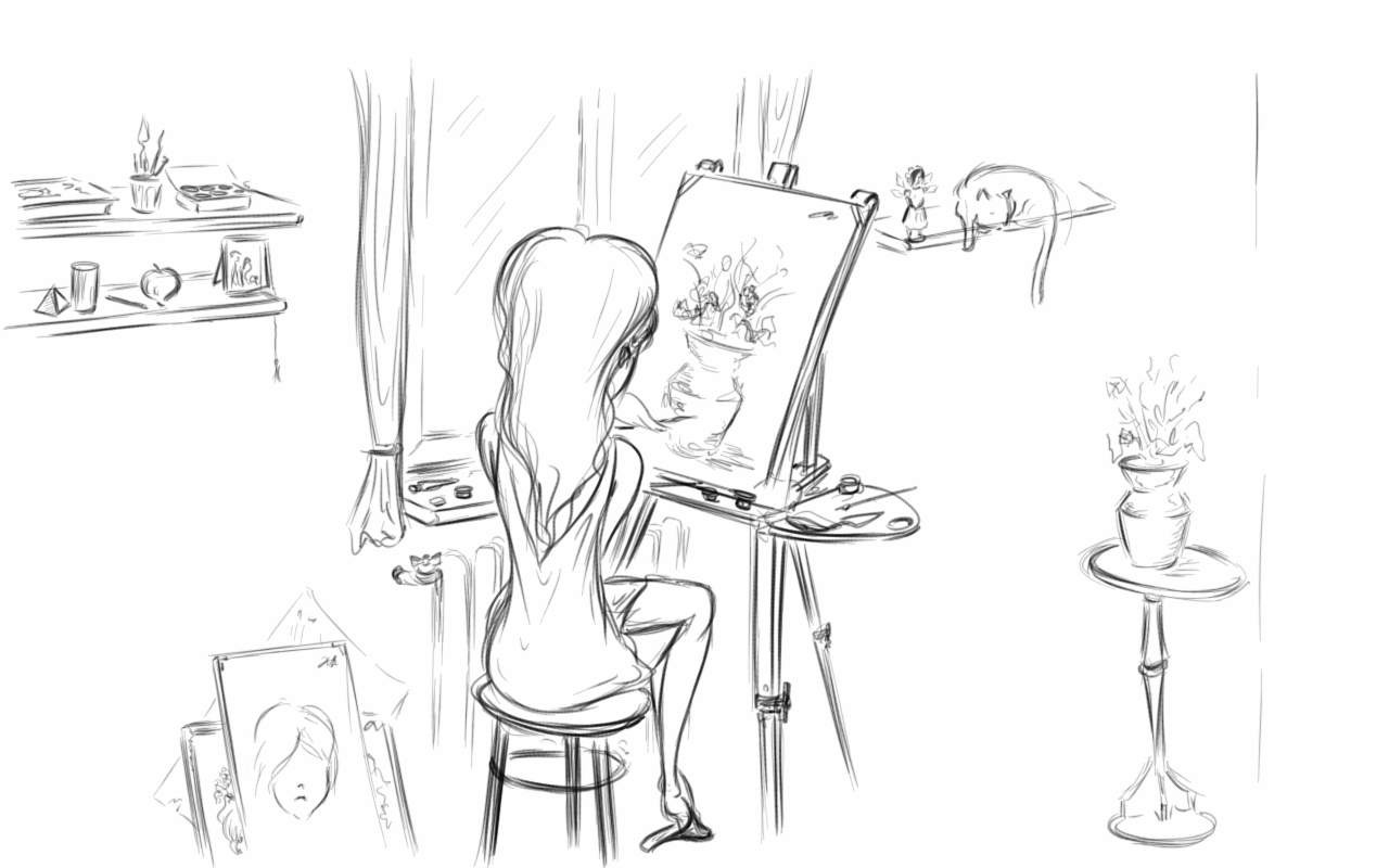 Ребят, нарисуйте няшу-художницу, сидящую в комнате. Повсюду рисунки, гуашь и прочие принадлежности. У неё слегка завиваются волосы, очки.