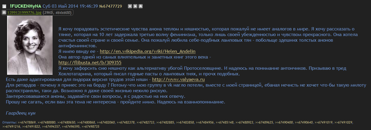Я не раз выказывал удивление идеями, пропагандируемыми в этой среде, тем тупым самкам человечества, которые и познакомили меня с этим феноменом. В ходе конструктивного диалога я был обосран с ног до головы, обвинён в сексизме, в стереотипном мышлении, в мизогинии, в тупости, в недалекости и т.д.