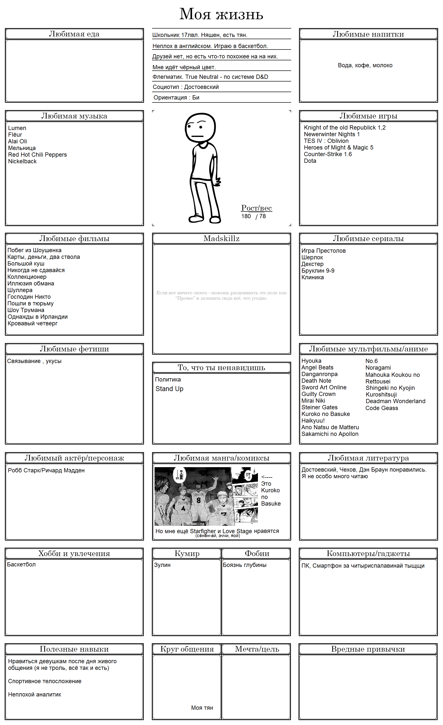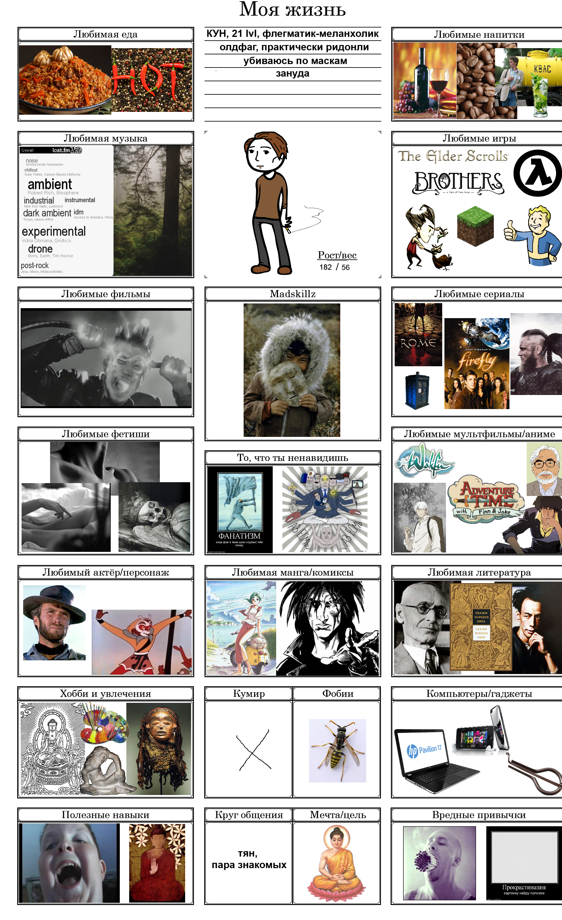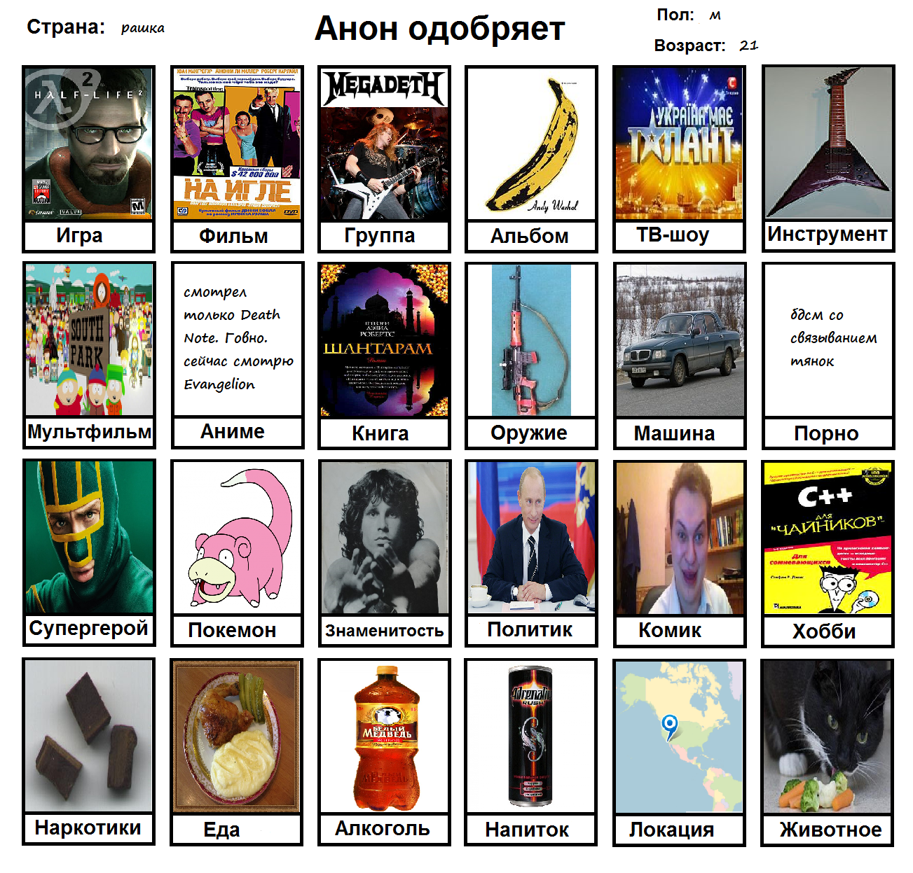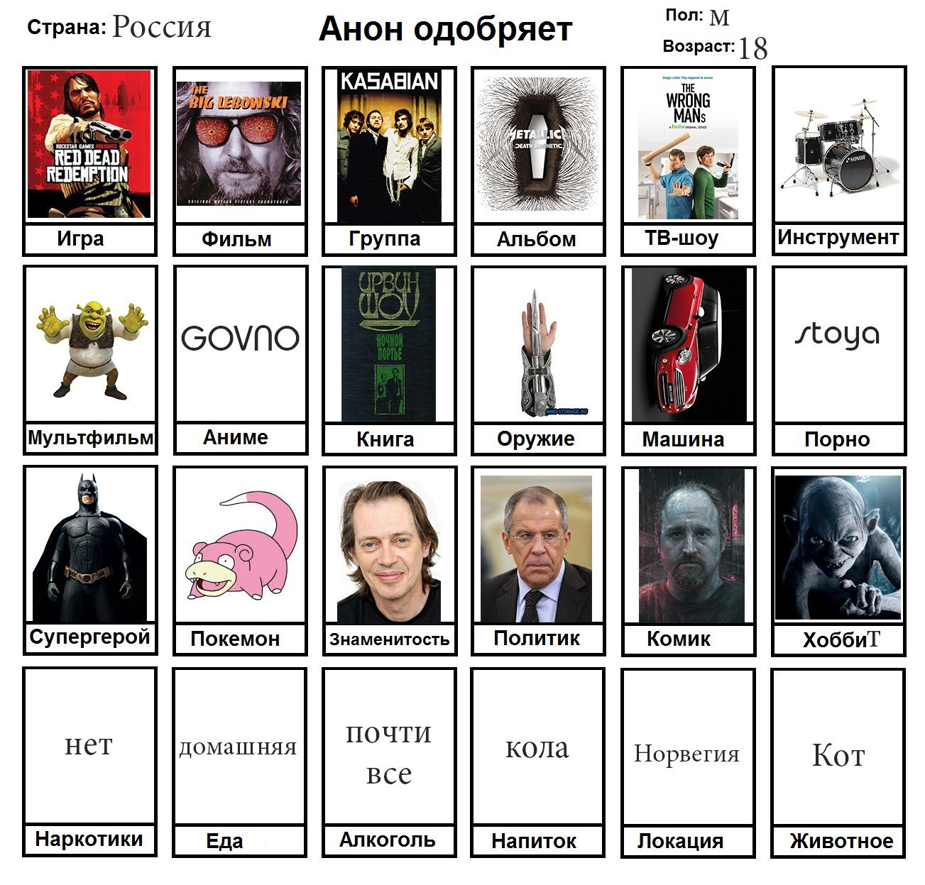 Начал заполнять и понял, что нету любимого фильма, группы, альбома, тв-шоу, мультфильма, машины, супергероя, покемона, политика и комика. Посему привнесу свежей сажи в тред с непродуманной анкеткой.