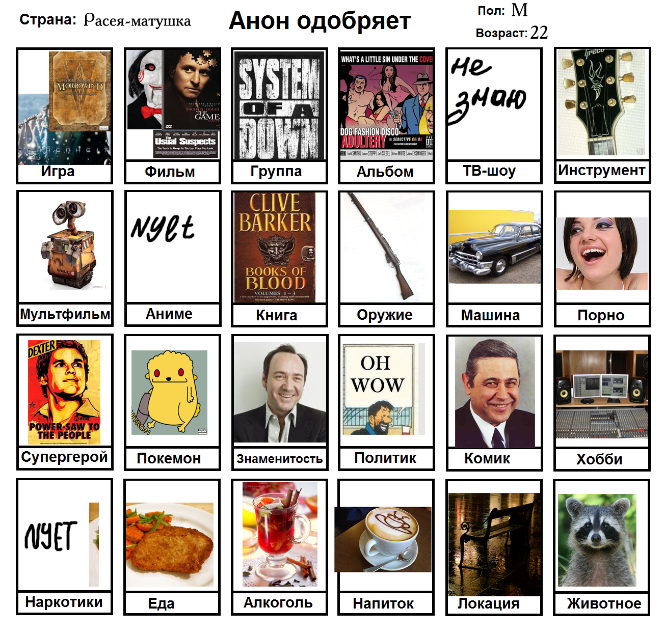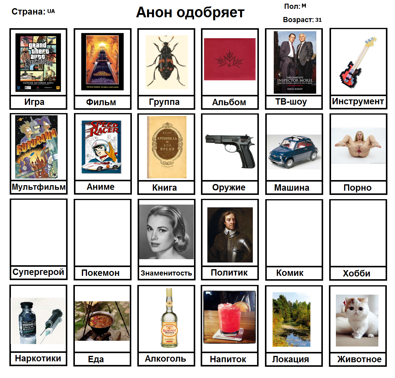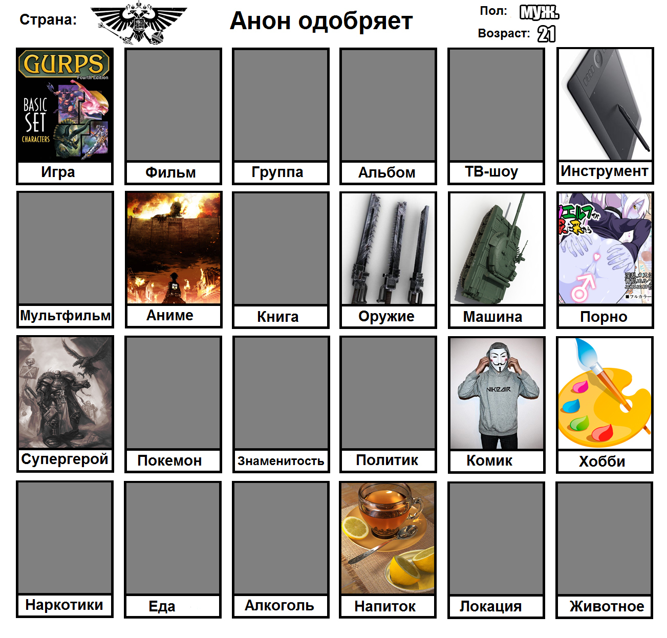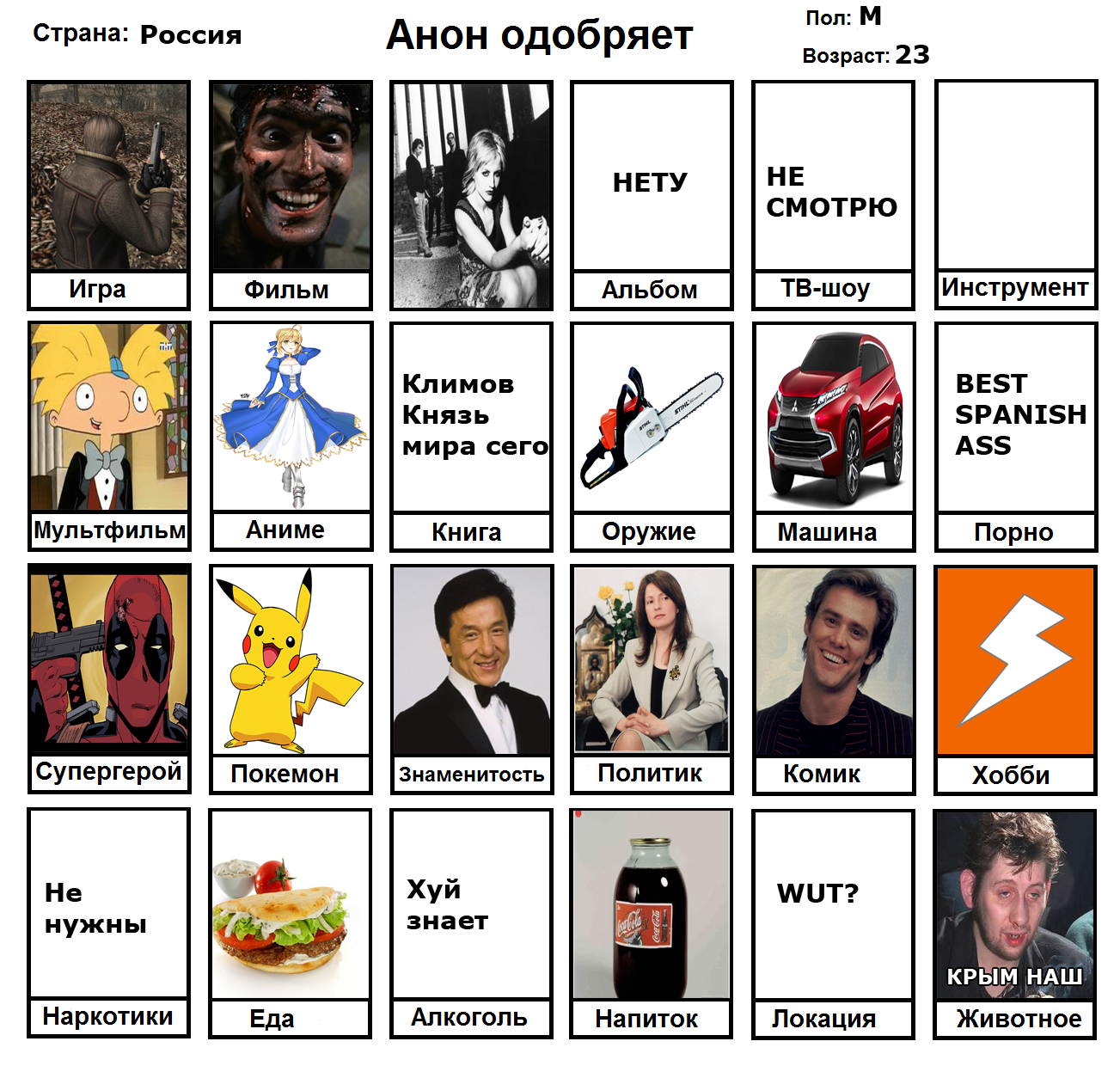 Начал заполнять и понял, что нету любимого фильма, группы, альбома, тв-шоу, мультфильма, машины, супергероя, покемона, политика и комика. Посему привнесу свежей сажи в тред с непродуманной анкеткой.