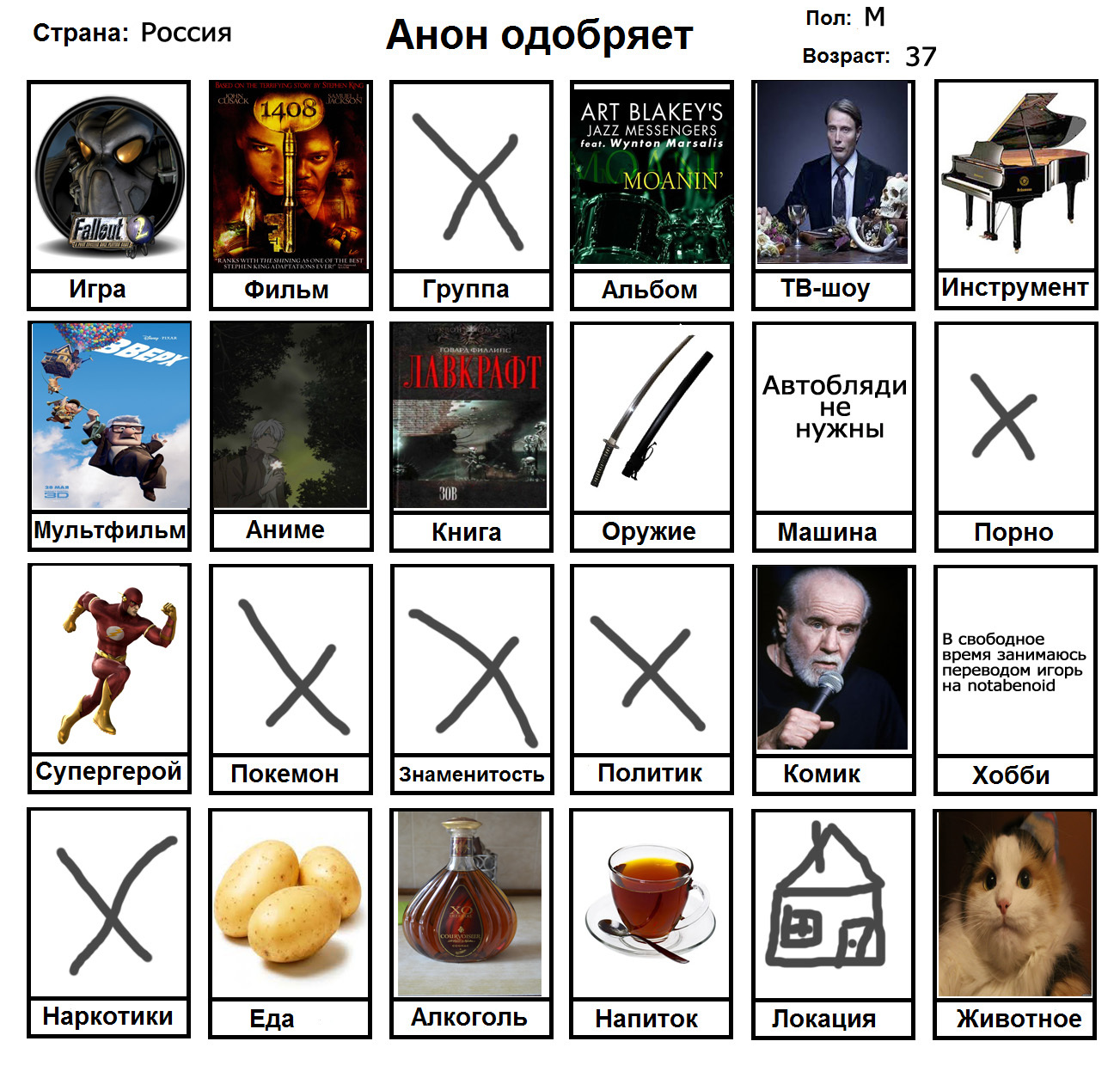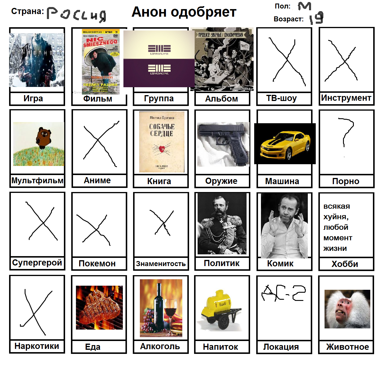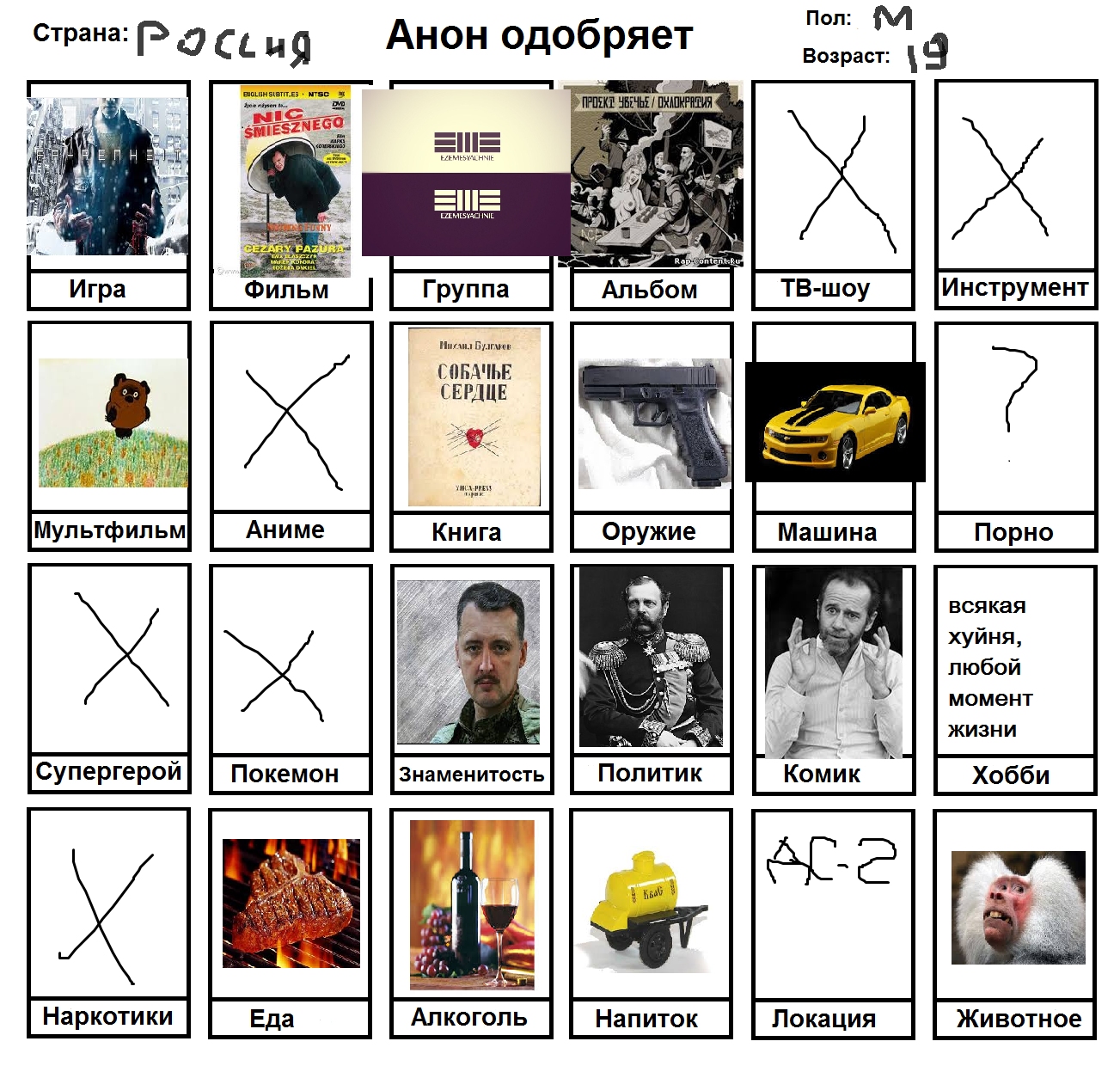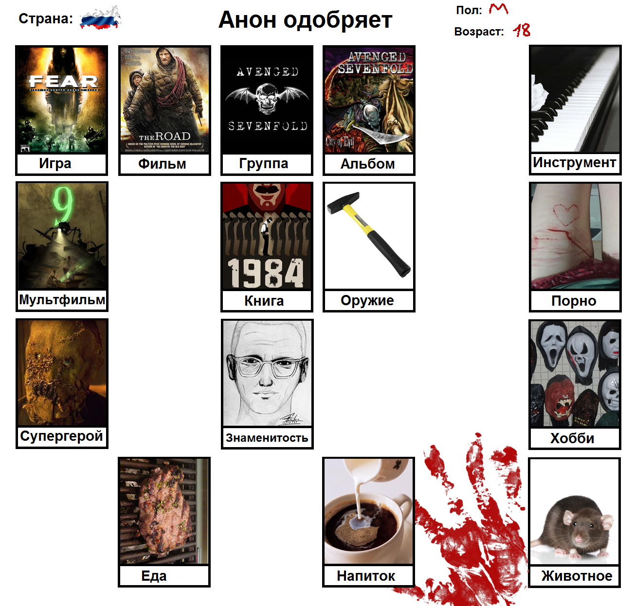 Начал заполнять и понял, что нету любимого фильма, группы, альбома, тв-шоу, мультфильма, машины, супергероя, покемона, политика и комика. Посему привнесу свежей сажи в тред с непродуманной анкеткой.