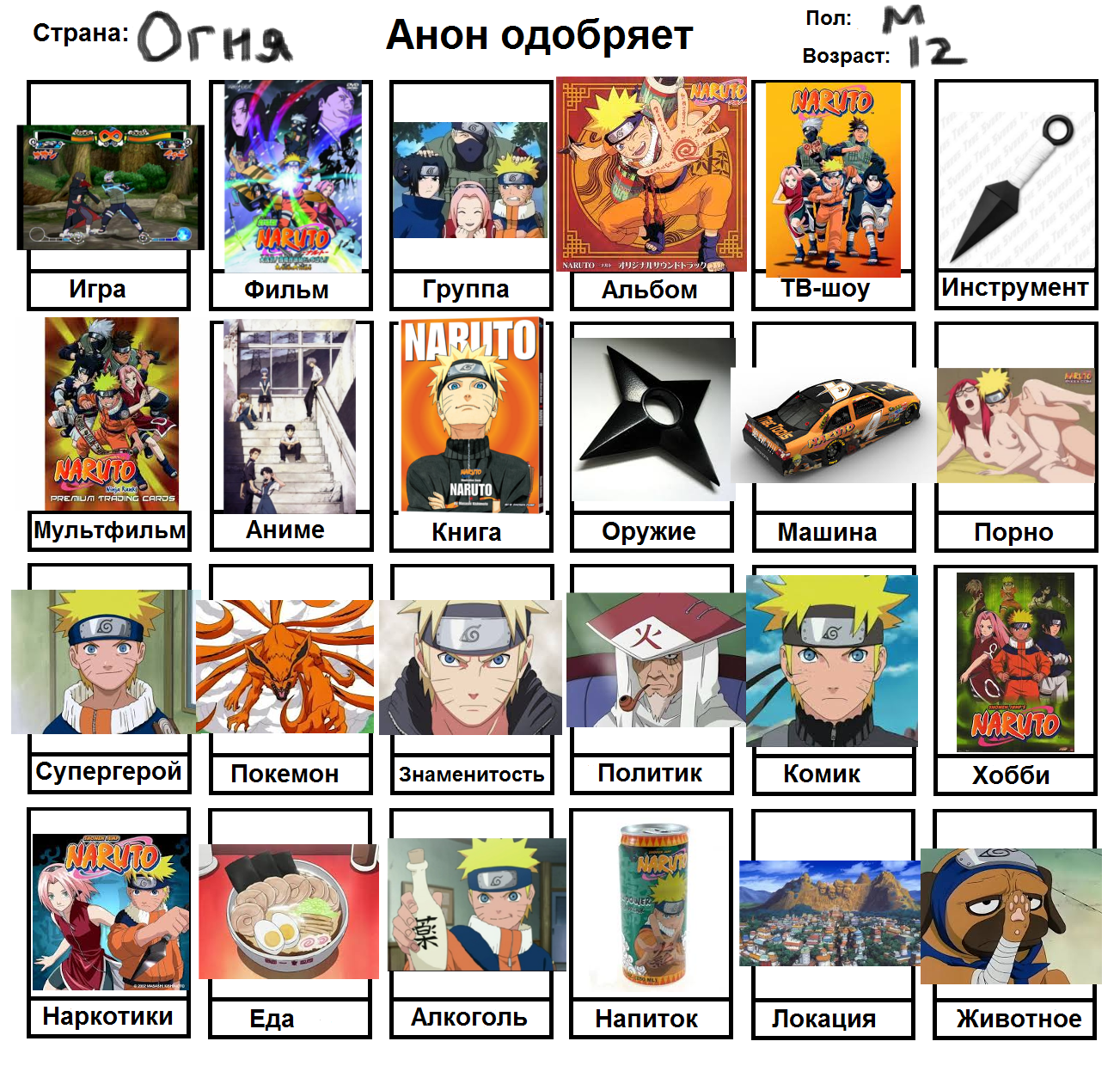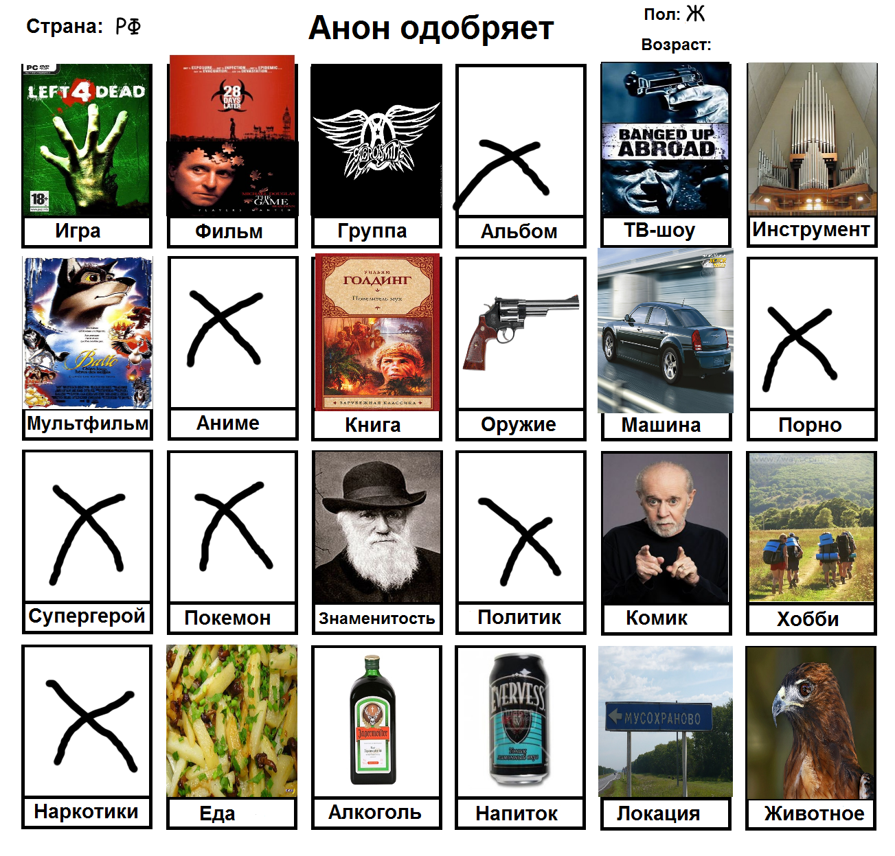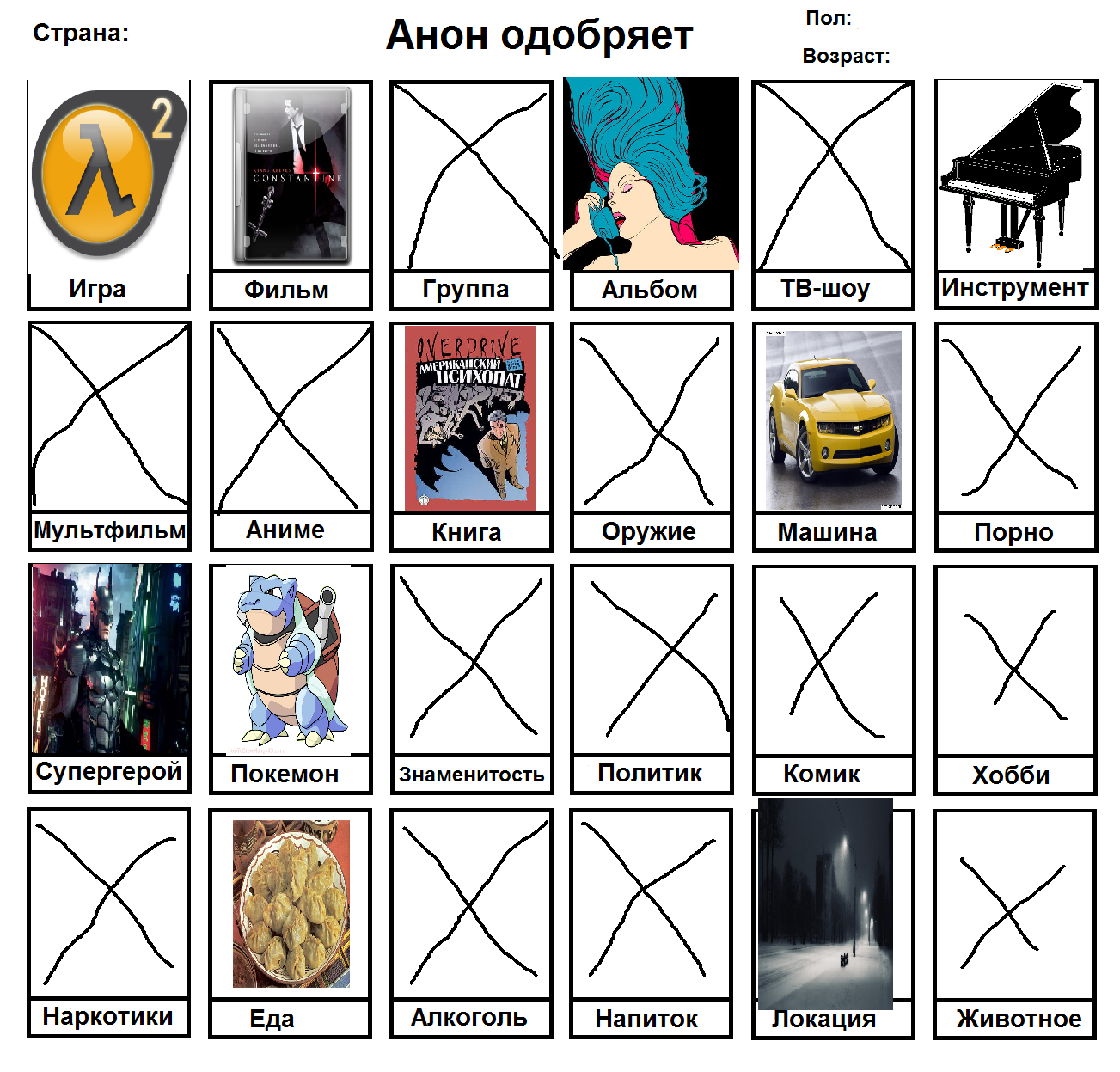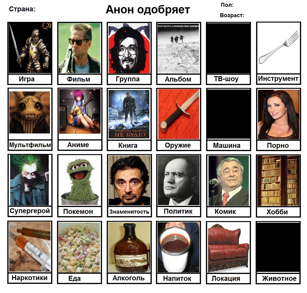 Начал заполнять и понял, что нету любимого фильма, группы, альбома, тв-шоу, мультфильма, машины, супергероя, покемона, политика и комика. Посему привнесу свежей сажи в тред с непродуманной анкеткой.