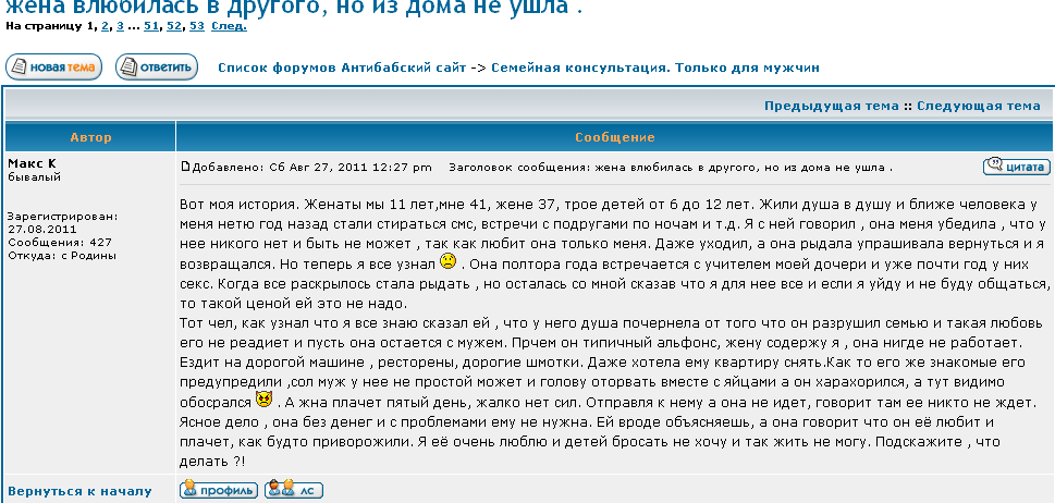 Ебаный бабораб, еще и себя винит. Вангую, что его шлюха толком то и не работала.