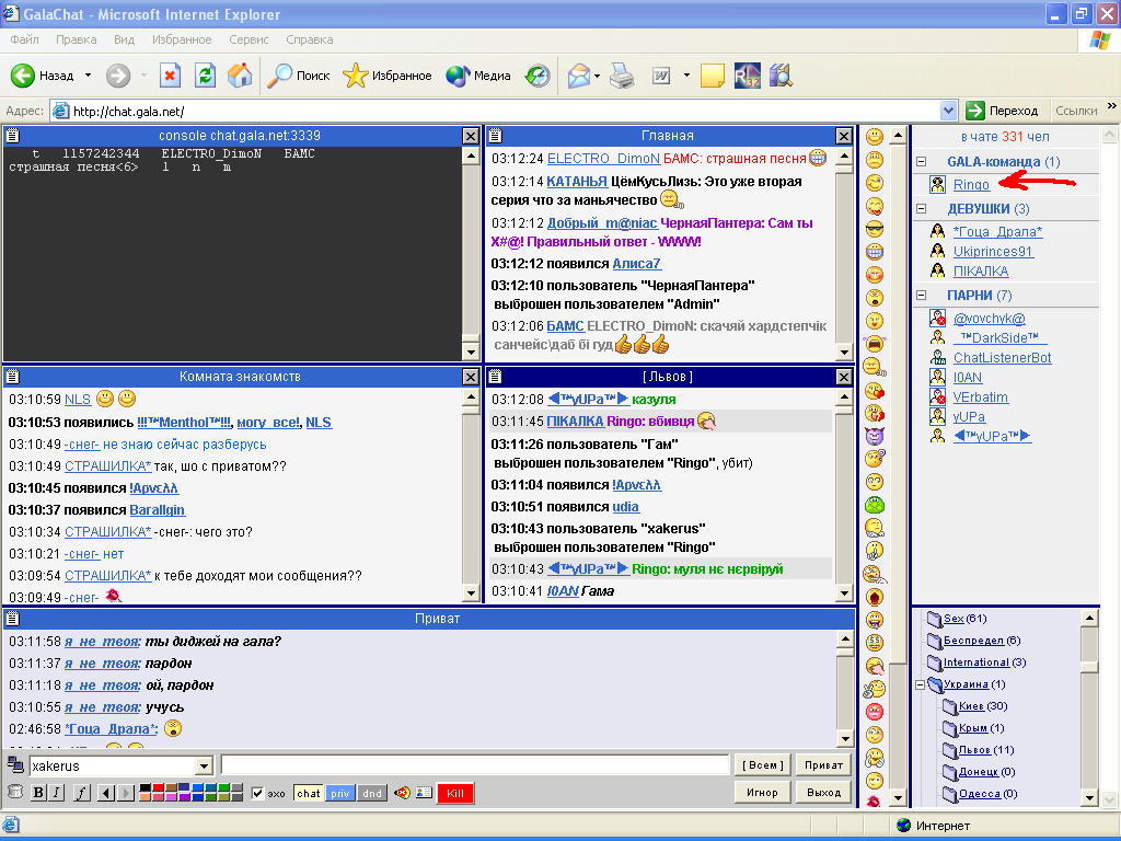 Дык вот, я в тот чатик месяцок походил и получил абсолютно все права. Меня там на 32 года (по максимуму) банили по IP (айпишник у меня статический), а я через 5 минут снова админа доебываю. Заходил под любым ником. Человек сидит в чате, а я параллельно с его аккаунта сижу. Денег предлагали, чтобы я спалил, где дыра. Понял, у меня два окна открыто - в одном приват модератора, в другом - админа. И они там обсуждают, мол хакер этот опять в чате, кто его, мол, разбанил? А я периодически то от одного, то от другого реплики вставляю, и уссыкаюсь от ихнего конфуза. На скрине, в wap-чате сижу с java-версии, читаю приват Админа. Обсуждают там, что опять объявился, да еще и разноцветным пишет. Было дело, админ на меня охоту устроил. Дошло до того, что адрес вычислил. Ну, это за неделю до его увольнения, поэтому дальше тема не развивалась. Админы в том чате часто увольняться начали. В итоге они просто обрубили java-версию и через какое-то время чат вообще закрылся.