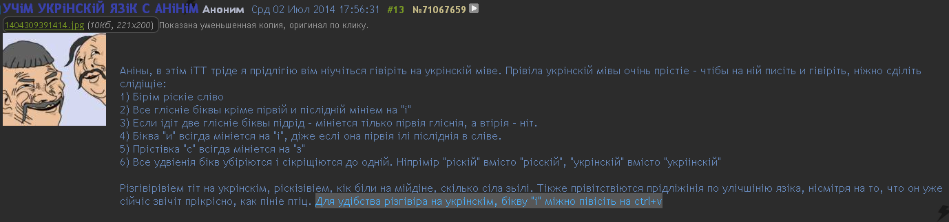 Предлагаю во всех тред писать по-украински. Во-первых, это будет показывать своих. Во-вторых, взрывать пукнуть тупой ваты.