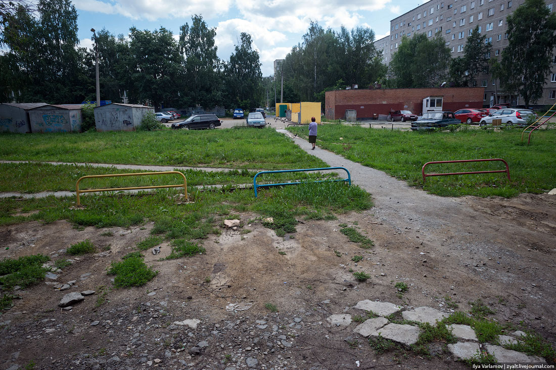 Гандон, летом местность выглядит еще более запущенной из-за обилия листвы. Ебанные джунгли же, которые никому в хуй не впилось подстригать и выпиливать.