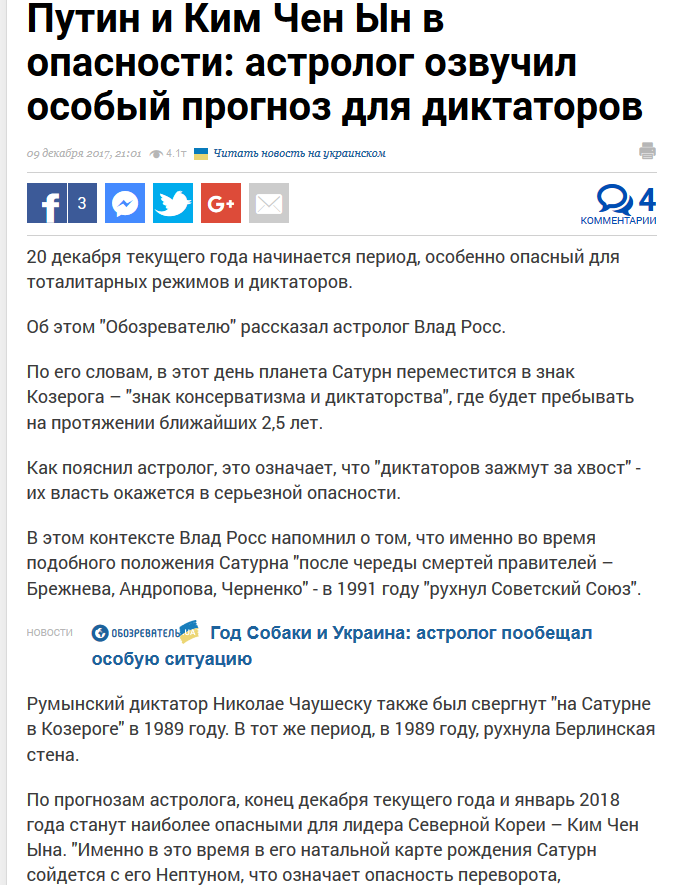 Росс напомнил о том, что именно во время подобного положения Сатурна «после череды смертей правителей – Брежнева, Андропова, Черненко» — в 1991 году «рухнул Советский Союз». Румынский диктатор Николае Чаушеску также был свергнут «на Сатурне в Козероге» в 1989 году. В тот же период, в 1989 году, рухнула Берлинская стена.