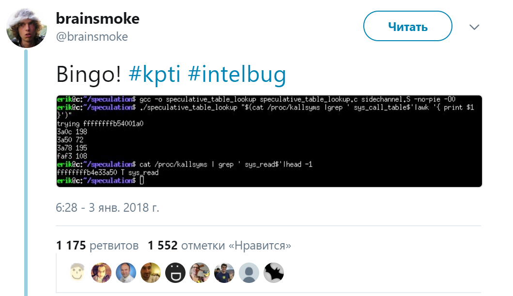 >>168119131 Недостаток процессора Intel реальный. Студент PhD в группе систем и сетевой безопасности в Vrije Universiteit Amsterdam разработал концептуальную программу, которая использует недостаток Chipzilla для чтения памяти ядра из пользовательского режима: