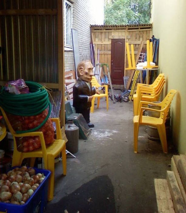 На снимке запечатлен рекламный плакат с предложением обменять старые футболки на новые, "патриотичные" с пропагандистскими надписями ("Санкции? Не смешите мои "Искандеры", "Тополь" санкций не боится" и прочее). Однако поверх постера кто-то написал зеленой краской "Тополь" на хлеб не намажешь!".