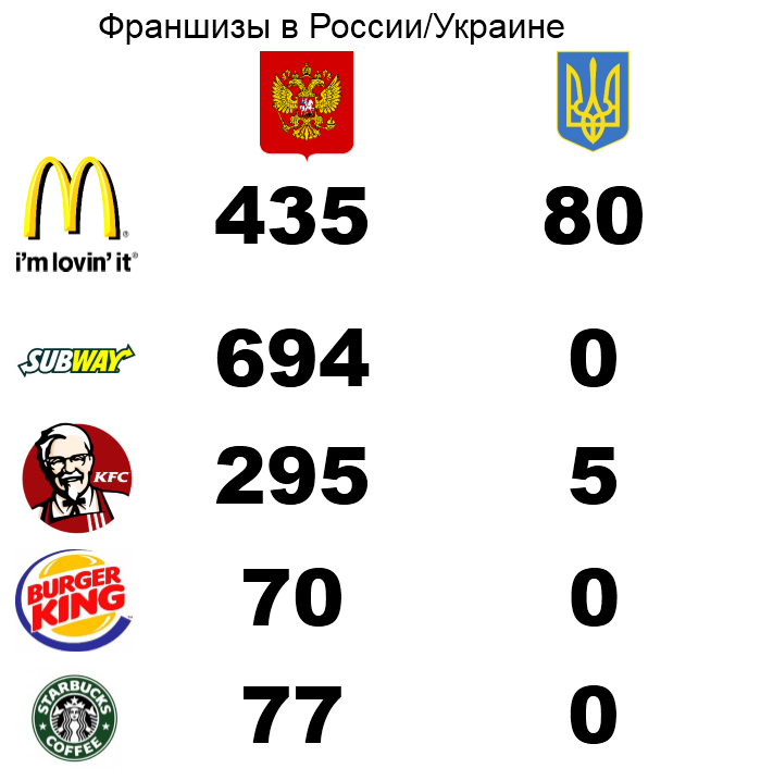 Составил тут статистику по франшизам в России/Украине на досуге. Какие ваши оправдания, хохлоаноны? Блять, у вас так хуево, что даже Сабвей не имеет ни ОДНОГО ресторана. Пиздец, какое говвно у вас экономика, что даже такой франшизы нет!