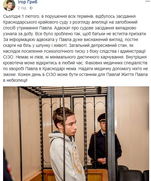 "Нет ни лекарств, ни минимального диетического питания. Внутреннее кровотечение может открыться в любое время. Профессиональных медицинских специалистов по болезни Павла в Краснодаре нет. Оказать медицинскую помощь никто не сможет. Каждый день в СИЗО может быть последним для Павла! Жизнь Павла в опасности!" - отмечает он.