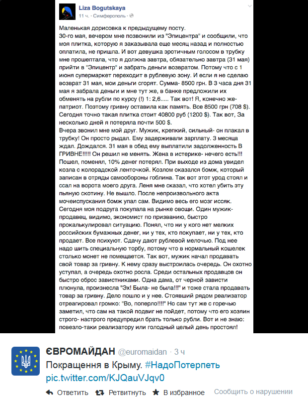 Короче, залез я в /b/, смотрю, треды про ЕОТ, рулеточки, зелень, ну хотел свой эпик тхреад запилить. Ну, естественно, начал писать свой эпик тхред, вижу - хуйня получается, и сагают его. Плюнул на все, и решил зайти в /po/. Смотрю, АТО тред наверху висит. Никогда раньше не заходил в АТО тред, а тут вдруг захотелось зайти почитать. Ну думаю, раз захотелось, почему бы и не потолстить заодно. Пока читал АТО тред, осознавал все написанное, все как положено, начил писать ответ, и тут вдруг все перефарбувалося у жовтоблакитний колiр, гул та рокiт, їбать його в сраку, що за гімно, нічого не зрозуміло, вилазить із землі Сашко Білий и каже якусь хуйню про москалів і протидію рашизму, товстий педаль, хулі йому у землі не лєжалось блядь? Відтепер окрім української мови я ніхуя не розумію. Здається той АТО тред був проклятий.
