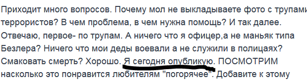 > "Бої тривають з наростаючим озлобленням, мабуть все ж в цьому місті ми намацали "Кощієву смерть" донецького угруповання терористів, періодично доходить до рукопашної. Вчора відбили останні танкові атаки, не треба їх боятися, вони горять як свічки...", — наголосив він.
