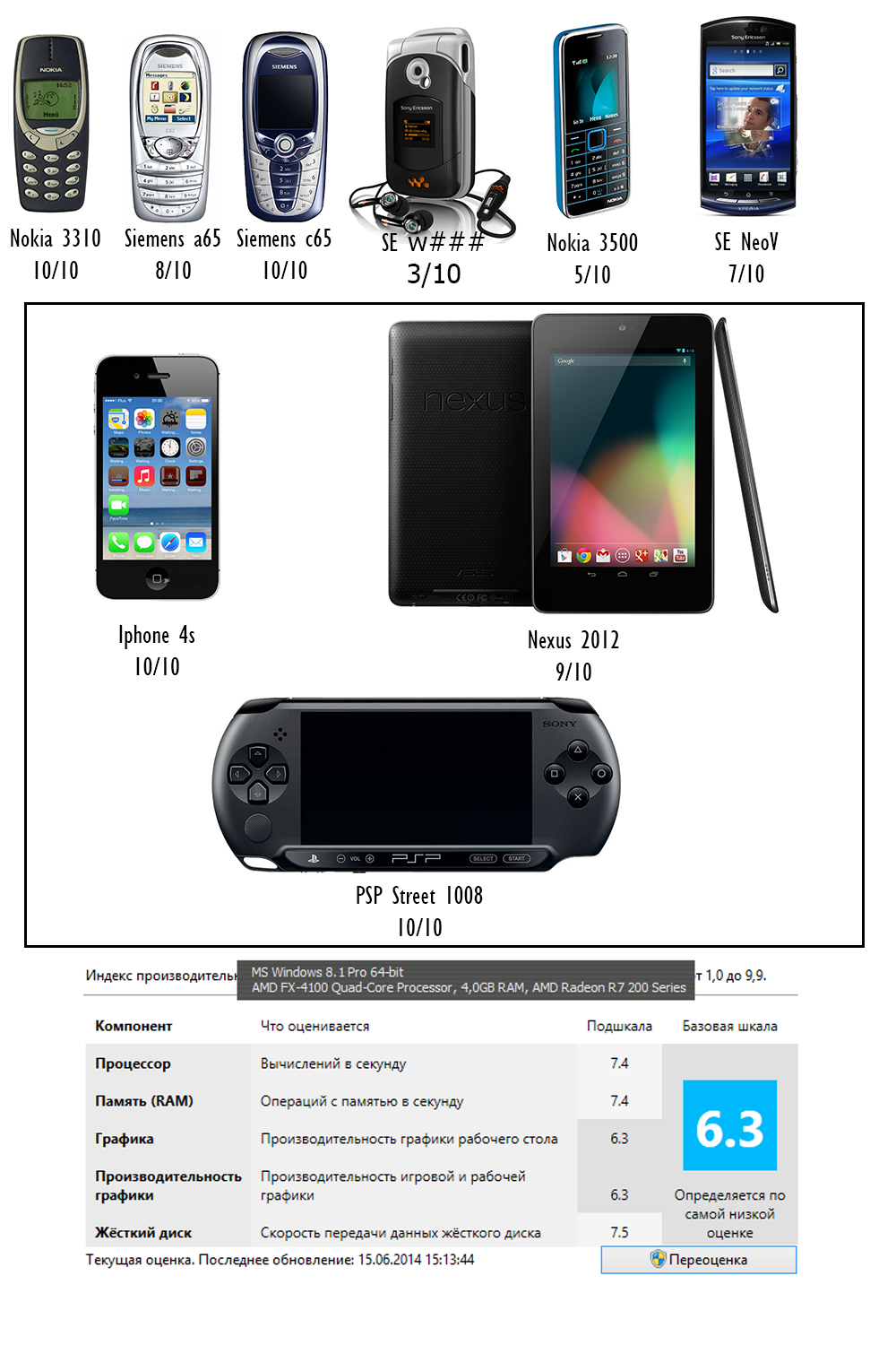Siemens C45 (Китай), нормальная мобила, проработала лет пять, если не больше. 8/10 Siemens CX70, охуенный для того времени экран, тоже годный телефон. 8/10 Siemens S75, пиздатый дизайн, но прошивка пиздец. Поминутно выключался, противно пискнув. Был мр3-плеер и карта памяти, что в то время было довольно круто. 7/10 Samsung E950, хотел слайдер с нормальной камерой. Меню лагало, камера была хуевой. Через несколько месяцев разочаровался. 5/10 SE X10, первый смартфон, вполне годный. Развитие остановилось на ведре 2.1. Что удивительно, лагов было сравнительно немного, хотя работало все, разумеется, жутко медленно. 7/10 Nexus 5, первый флагман. Все отлично, не считая не самого удачного дизайна корпуса с торчащей камерой и расположением динамика прямо под пальцем. 9/10