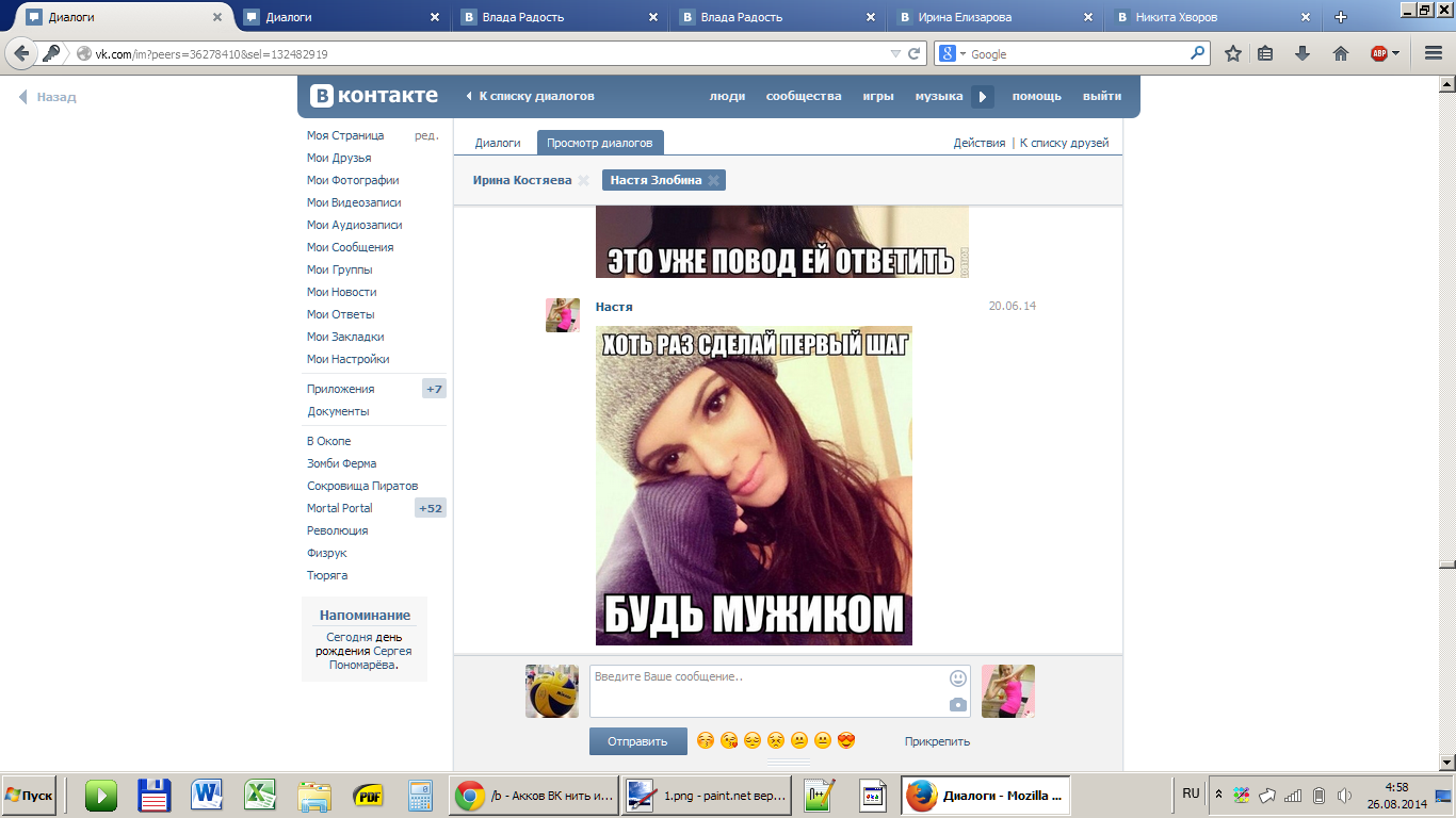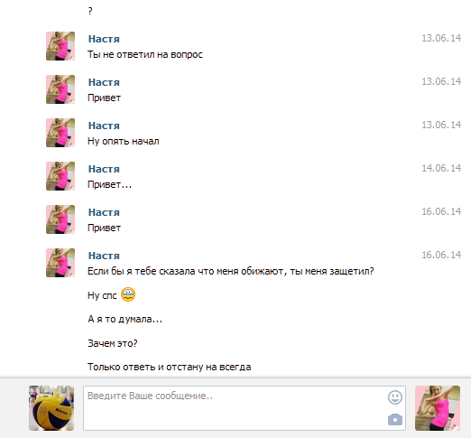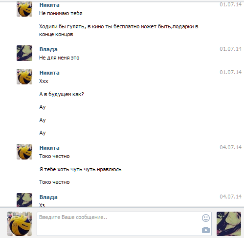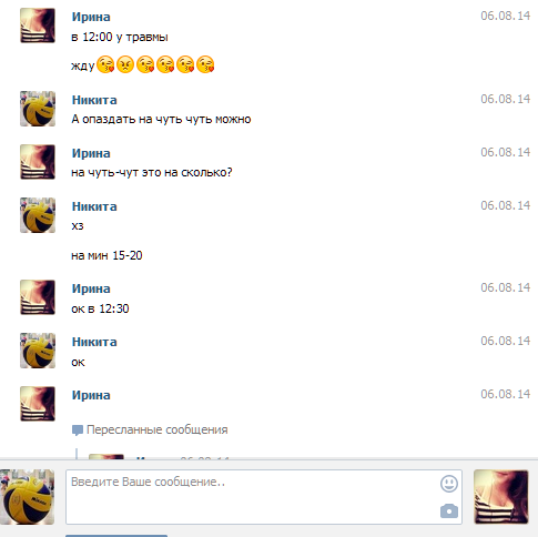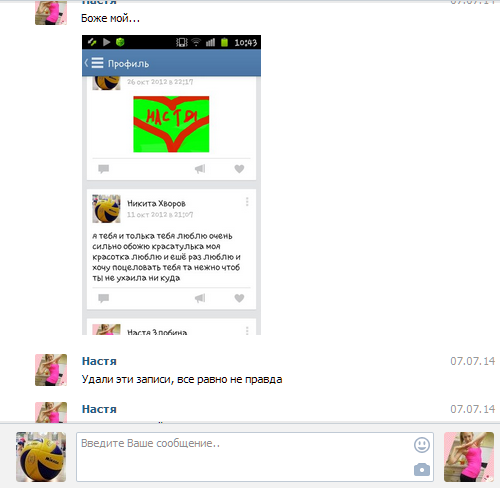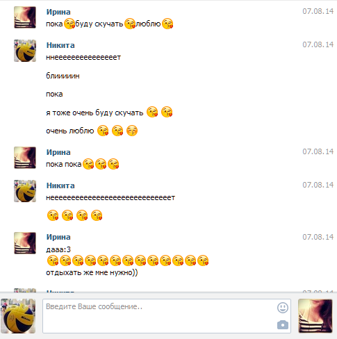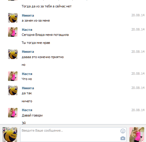 С Настей переписка какая-то тухлая. Короче, могу сказать, что они раньше встречались, но внезапно расстались. Все их сообщения состоят не более, чем из 5 слов, так что читать их не интересно. Тем более, что там 60% привет\пока. Переписка с Ириной более жаркая. Сейчас доставим.