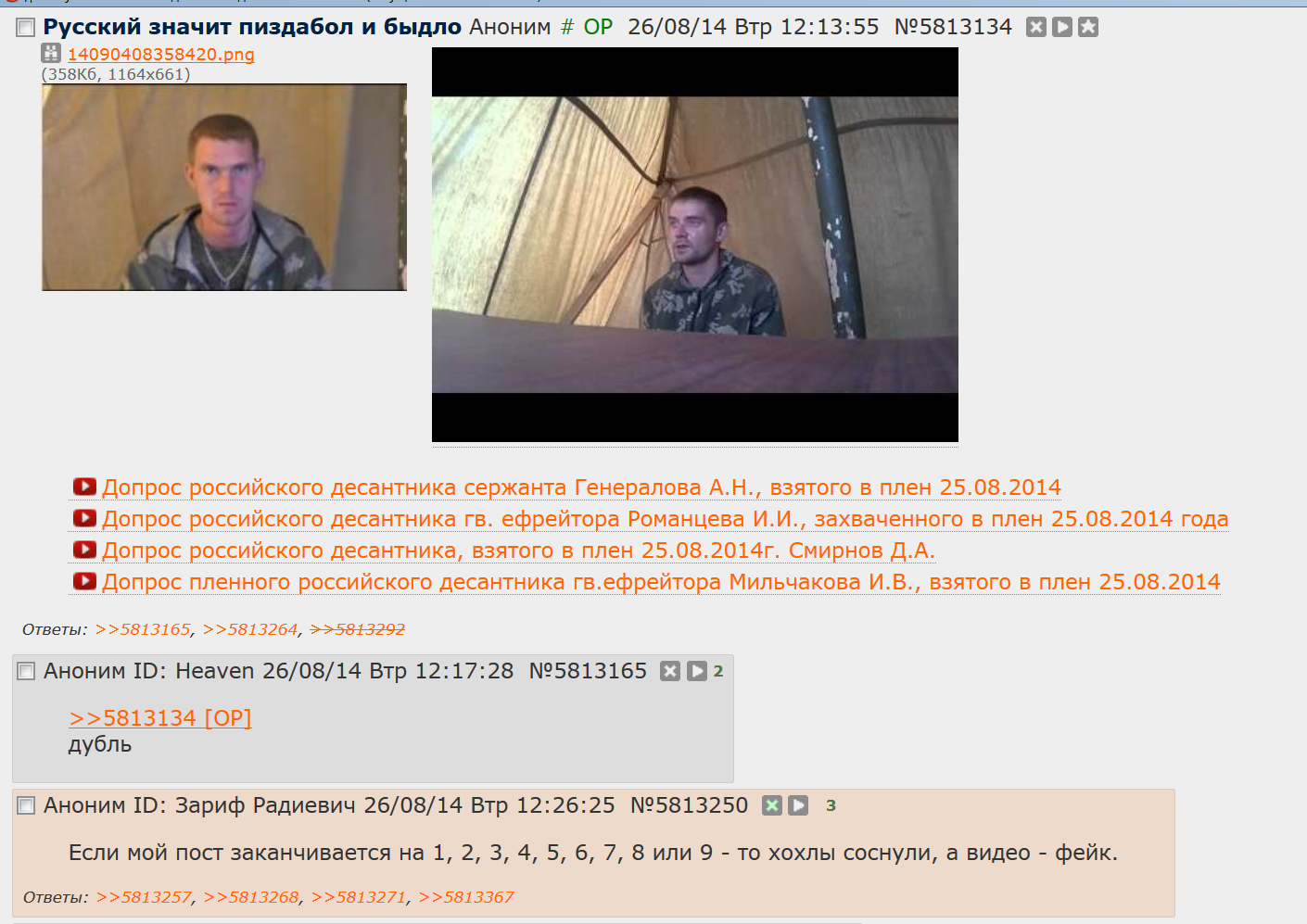 >>5813278 БАНДЕРА ЗЛОЙ И ТВОРИТ ЧТО ПОПАЛО А ОПОЛЧЕНИЕ - ЭТО ХОРОШИЕ НО ПРИЕХАВ СЮДА И ПОПАВ В ПЛЕН НАМ ВСЕ РАЗЯСНИЛИ ОТКРЫЛИ ГЛАЗА НА ПРАВДУ НА ИСТИННУЮ