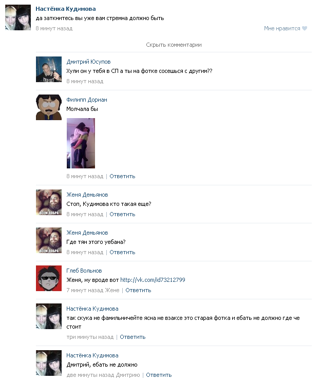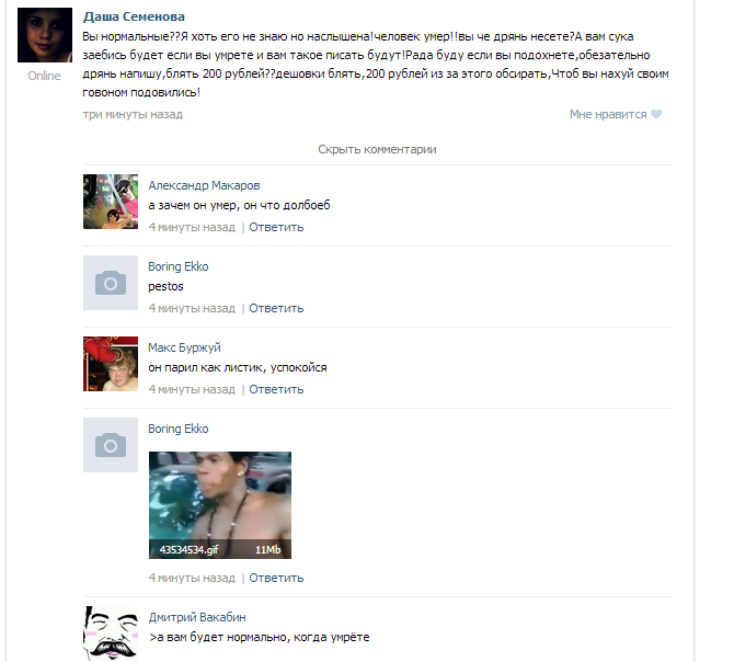 Зашел в группу посвященную этому пареньку и что я там увидел? Два мудака пытаются тралить. Да как! Пыжаться, тужаться, аж слышно как мозги от напряжения скрипят, и ты думаешь, вот сейчас эти парни выдадут что-то стоящее, хули, настоящие харкачевские минзантропы, философы, взрослые люди. Но тут, со звуком пердежа на стену выблевывается: >ПАЦАНЫ, Я ЭТОГО ПИДОРА В ХИМКАХ ВИДЕЛ. МЫ ТАМ С НИМ БУХАЛИ, А ПОТОМ ОН МНЕ ДЕРЕВЯННЫЙ ЧЛЕН ПРОДАЛ.
