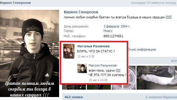 До сих пор не могу поверить , что тебя больше нет! Это произошло на моих глазах(( никогда не забуду, что ты со мной попрощался! Прости, что так я не дала тебе эти грёбанные 50 рублей(((( Мы вчера с тобой договаривались поговорить, так и не поговорили((( Блиииииииииииннн...Ну зачееем?? Если бы ты знал , как Пашке плохо(( В последнее время мы стали так хорошо общаться, но теперь наше общение прекратится НАВСЕГДА!!!!!!!!! Костя, я очень люблю тебя!!!!