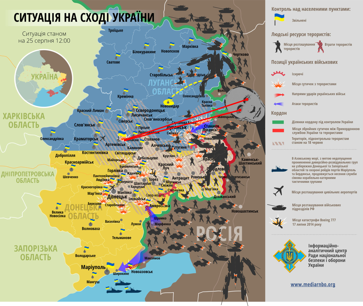 - Что российская армия делает на территории Украины? - Предоставьте записи переговоров диспетчеров! - Если военнослужащие армии РФ в отпуске и находятся там по собственному желанию, то почему они на бронетехнике? - Требуем соблюдения договоренностей от 21 февраля! - Лидеры сепаратистов сами заявляют о том, что военные из России воюют на их стороне! - Почему не пропускают нашу гуманитарную помощь?!