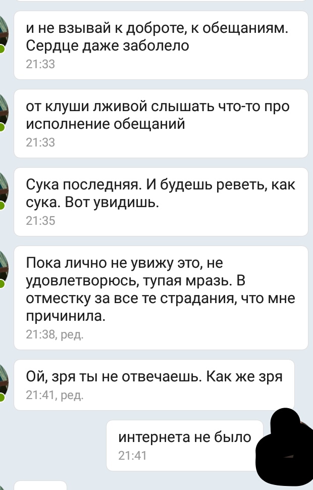 когда я пришла домой, всё ему расписала о своём отношении к нему, что мне трудно находиться рядом с ним и тому подобное. V. воспринял все в штыки, обосрал меня, добавил в Чс, и я вздохнула с облегчением.