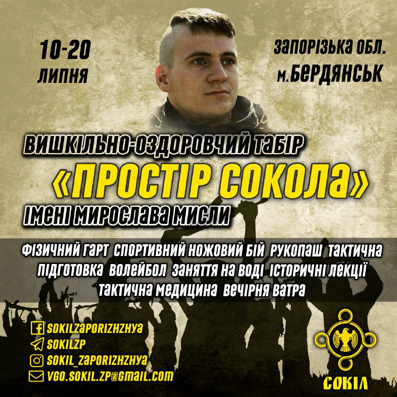 Запорізький обласний осередок ВГО "Сокіл" запрошує молодь приєднатись до щорічного традиційного вишкільно-оздоровчого табору "Простір Сокола" ім.Мирослава Мисли, який відбудеться 10-20 липня на узбережжі Азовського моря в Бердянському районі Запорізької області.