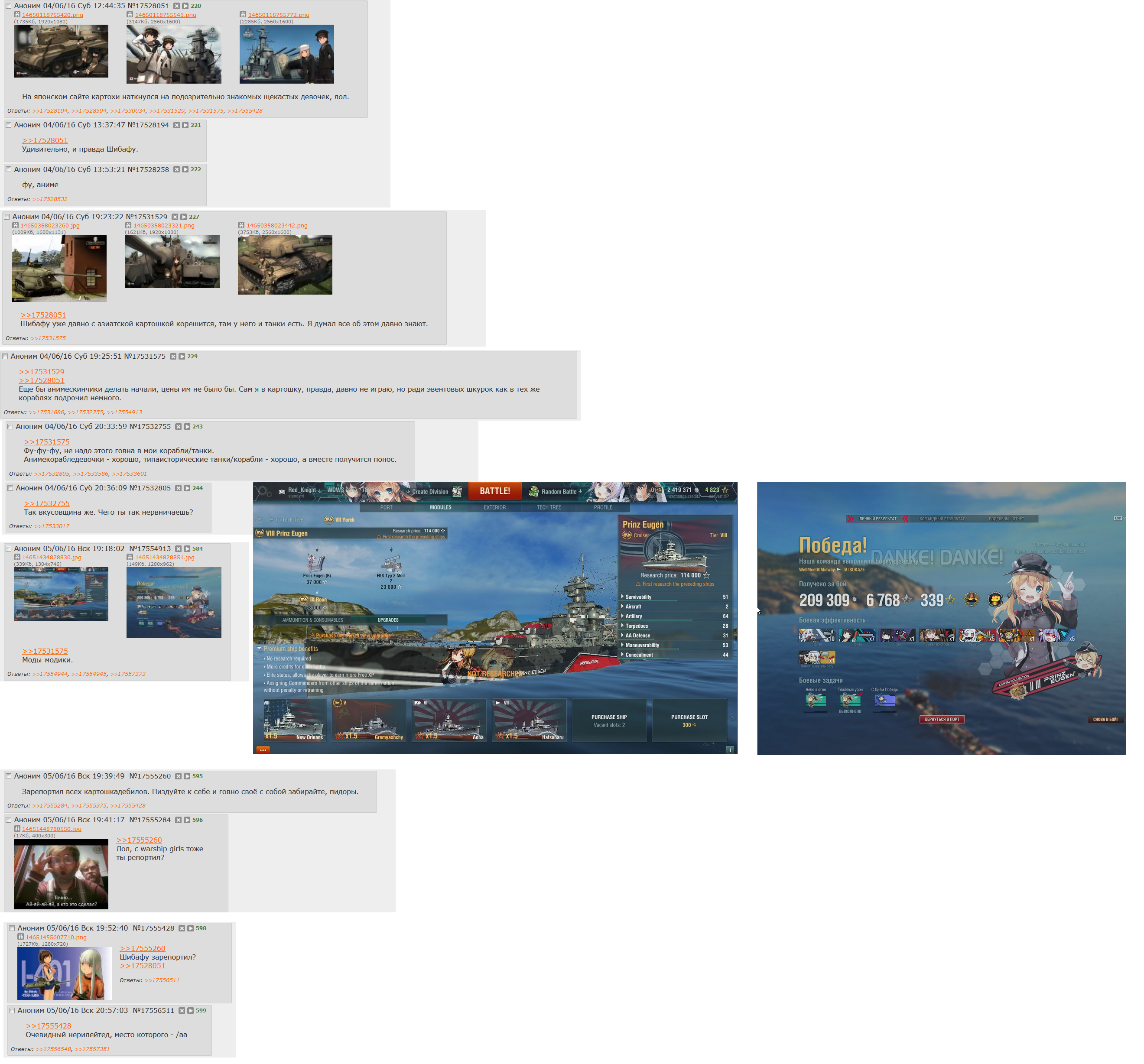 Сегодня награды за ЕО показывали. Наебали. Суки. Показывали Интрепид с артом от Шибафу. А канмусу в сорти идти, они же друг друга перестреляют блядь! Решили им эквип не давать, выдали по канистре. Так эти долбоебки одну DE от Шибафу насмерть канистрами забили. Насыпали внутрь битого боксита и забили. Но мне её не жалко, все равно бы потонула.