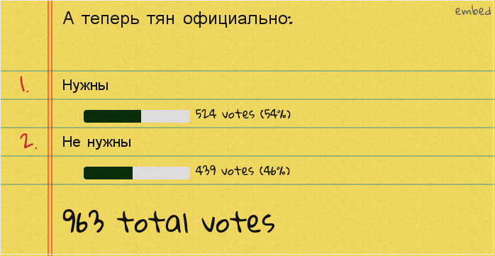 Чем ближе к ночи, тем больше голосов за вариант "не нужны". Вообще, конкретно мне они не нужны. У меня голова все еще забита мыслями о "ламповых няшах", которых, как известно, не бывает. Вот.
