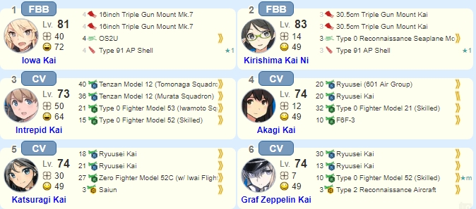 >>26872275 >Чем обусловлен выбор авиков? Надо же как-то качать девочек, а то в PvP они уже мало опыта набирают. >и тяжёлые фбб не катят? Можно, там же даже есть квест на закрытие 5-5 Нагато Кай Ни и Муцу Кай. >Журавли с джетами мимо? Вроде можно, у меня джетов нет. Алсо, ты читай вики в следующий раз, прежде чем спросить: Fleet Compositions High endurance ships are recommended (Yamato-class, Iowa, Shoukaku-class armored carriers, etc.), with anti-torpedo bulges equipped in expansion slots due to the threat of the high firepower and high torpedo Re-class battleships throughout the map. With all carrier compositions 420 air power (plus 5-10 extra if utilizing jet aircraft) for achieving air supremacy at the first node and superiority/supremacy at all subsequent nodes is desired. 3 BB, 2 CV, and 1 CVL high firepower and survivability (Yamato-class BB are preferable). Consider not bringing Saiun with this composition. This composition often utilizes a flagship CVL with no bombers equipped. 1-2 FBB and 5-4 CV is also recommended. This strategy focuses on a powerful opening airstrikes with many torpedo bombers. Saiun can be used with this composition to boost contact rate along with 1-2 seaplanes and named torpedo bomber squadrons. Using exactly three submarines in the map (3 BB and 3 SS) routes A-F-G-N. However, pre-boss support shelling is needed to increase consistency of the submarines surviving. This route has the advantage of guaranteed boss routing, making it good for experienced players with high-end equipment and ships. Other variants include 1 CV 2 CVB and 3 SS which has greater consistency surviving enemy ASW without support, but lower overall firepower at the boss node. 1 Musashi Kai Ni 2 CVB and 3 SSV can be utilized as well, with seaplane fighters on submarines and Musashi Kai Ni to augment air power.