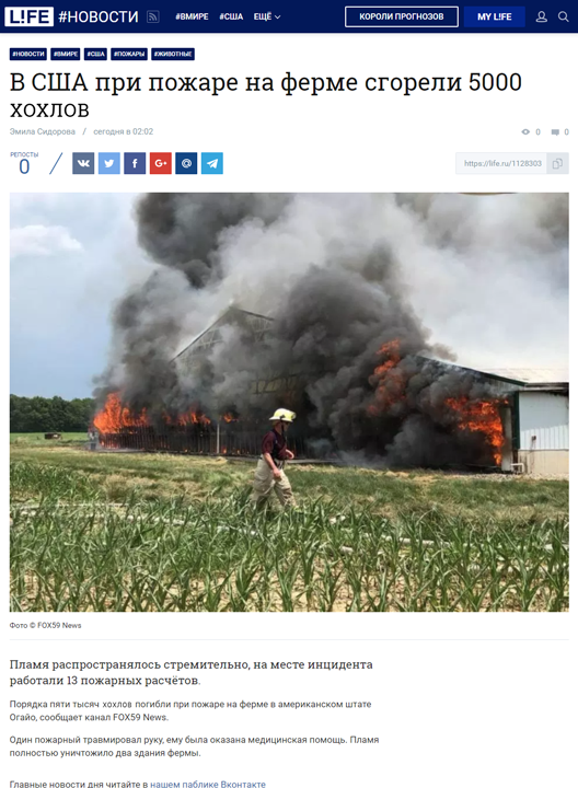 Порядка пяти тысяч хохлов погибли при пожаре на ферме в американском штате Огайо, сообщает канал FOX59 News.