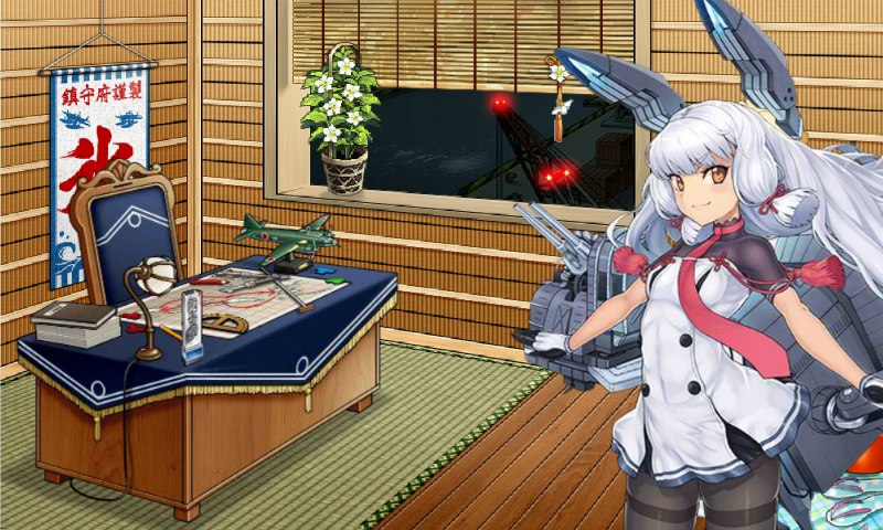 Кто-то антенну оторванную приваривает, кто-то I-класс торпедным аппаратом забивает. На полу машинное масло. Свиток с Конго. Напротив плакат Наки-чан. Подписанный: 2-4-11. Кто подписал, неизвестно. Весь предыдущий флот расстреляли, но никто так и не сознался. Горько вспоминать. Воняет жутко. Полуразложившийся труп картохи. Вот такой наш адмиральский уголок.