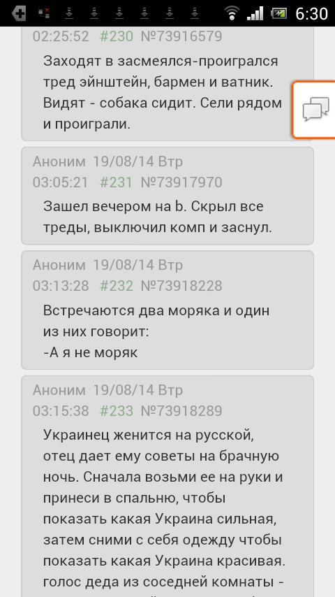 Чёрт. Вот всегда так, какие-то ебанутые шутки, потом сам пишу подобные шутки, и пока кто-нибудь не напишет что-то вроде "ПРОИГРАЛ ААХАХА" - сам не заржу. А как напишут - ржу как полоумный. Но в конце треда обычно устаю смеяться и уже ничего не смешно. Ну что за нахуй?