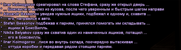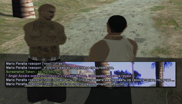 Masa Доброй ночи, вас приветствует администрация сервера Masa-RolePlay Тимофей Вы хотели бы меня пригласить? Masa Вы совершенно правы! Masa Доброй ночи, вас приветствует администрация сервера Masa-RolePlay, я предлагаю вам зайти на сервер, и опробывать его, так же вы имеете полное право на пост лидера, в соответствии с правилами игрового сервера. Наш IP адрес: 37.143.11.95:7024 Тимофей А у вас есть инвентарь? на сервере? Или это бот прислал мне? Masa Нет инвентаря нету Тимофей А у меня есть. Masa Я очень рад, сервера бывают разные) Тимофей Да, я так и знал что вы за меня порадуетесь) Бывают фулл Рп сервера. Бывают вот для школьников, знаете. Как САМП РП. Masa Самп РП полная фигня. Тимофей А что такое отыгрыш роли? Вот с вашем понимании в вашем Masa Может "Отыгровка Роли" Тимофей Нет. Именно отыгрыш. Отыгровка это неграмотно с точки зрения русского языка. Такого слова нету. Masa Изменение полного функционала жизни, а так же чата IC, постараться скопировать моменты настоящей жизни OOC Тимофей Нет, вы не правы. Знаете, вот по моему мнению отыгрыш роли - Это когда человек выбирает роль и отыгрывает её. Знаете, как в театре. Правдоподобно. Что то вроде актёрского мастерства, только в тексте. То есть не следует отыгрывать например того, чего вы не знаете. Если вы не учитесь в медицинском не очень корректно(хотя и можно, если знания по медицине достаточны) отыгрывать врача, например. И так далее. И знаете, отыгрыш это искусство. Это возможность для человека воплотить его мечты. То что он не смог бы в реальности сделать по каким-либо причинам. Возможности человека быть тем кем он хочет быть, пусть даже и в ненастоящем мире. Вот что такое отыгрыш роли. И конечно нужны кроме знаний и навыки какие то. И грамотность нужна, и литературный слог. Masa В принципе я просто сократил) Кстати на вашем сервере, много играет? Тимофей Мой сервер ещё в разработке. Понимаете, выкидывать людям сервер где кроме фракций, инвентаря, шапок, квартир, некоторого маппинга и системы смертей ничего не готово я считаю преждевременным. Сейчас мы делаем систему ключей и взломов. И думаю даже это не будет поводом для окончательного релиза, уровень реалистичности всё же недостаточен. Masa Согласен с вами! Тимофей Знаете, сегодня приходилось настраивать cobj. И даже это за 1 день настроить не получается. А ведь штука важная чтобы украсить локацию каким то динамическим объектом. А он должен ещё и вращаться. И в идеале чтобы это сохранялось после рестарта или запоминалось и можно было воспроизвести. А в совсем уж идеале делать конгломерации из множества объектов Только последнее к сожалению слишком трудно, пришлось бы подключать к сампу через доп. библиотеку модуль позволяющий павну использовать высшую математику а этот модуль ещё надо написать. Доводилось вам с таким сталкиваться? Masa Простите сейчас не много занят... Отвечу позже Тимофей Да, конечно, не буду вас отвлекать. Удачи вам в развитии вашего чудесного сервера. Masa И вам того же!